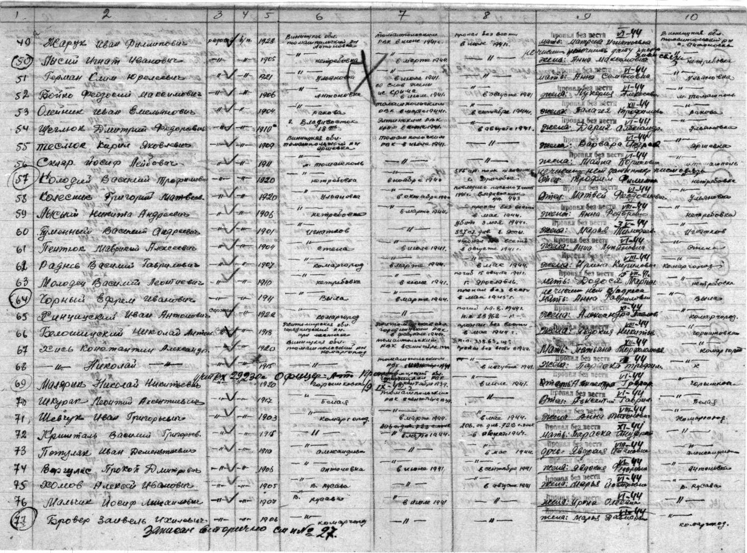 Quote (zhekamch) Подскажите пожалуйста вот что есть в ОБД Фамилия Крамаренко Имя Никита Отчество Павлович Дата рождения __.__.1903 Место рождения Херсонская обл., Каховский р-н, с. Н.-Маячка Дата и место призыва __.08.1941 Чаплинский РВК, Украинская ССР, Херсонская обл., Чаплинский р-н Воинское звание рядовой Причина выбытия пропал без вести Дата выбытия __.05.1944 Название источника информации ЦАМО Номер фонда источника информации 58 Номер описи источника информации 977522 Номер дела источника информации 141 ИЗ ПРИКРЕПЛЕННОГО ДОКУМЕНТА ОЧЕНЬ ПЛОХО ВИДНО , НО ВИДНО ЧТО ПОХОРОНЕН V-44 -КАК ЭТО РАСШИФРОВАТЬ? ТОЧНЫЙ АДРЕСС МОЖНО КАК-ТО УЗНАТЬ? СПАСИБО В записи указано, что он пропал без вести. V-44 - это май 1944 г. Это дата пропажи, но она техническая, т.е. абсолютно не имеет никакого отношения к действительной дате пропажи. Скорее всего, где-то в это время были просто освобождены родные места бойца.