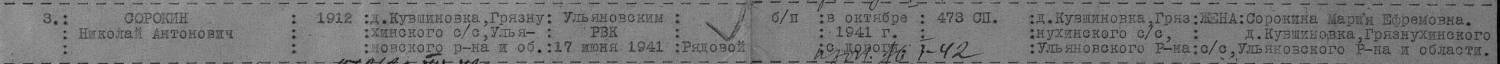 Quote (NastyaK) Здравствуйте, помогите найти информацию о безвести пропавшем Сорокине Николае Антоновиче, 1911 года рождения, призывался - Куйбышевская область (Ульяновск, Луговской сельсовет, деревня Кувшиновка Номер записи 64967854 Фамилия Сорокин Имя Николай Отчество Антонович Дата рождения __.__.1912 Место рождения Дата и место призыва 17.06.1941 Ульяновский РВК, Ульяновская обл., Ульяновский р-н Последнее место службы 473 СП Воинское звание рядовой Воинская должность Причина выбытия пропал без вести Дата выбытия __.01.1942 Место выбытия Первичное место захоронения Госпиталь Родственники Доп. информация Название источника информации ЦАМО Номер фонда источника информации 58 Номер описи источника информации 977521 Номер дела источника информации 137 Номера листов источника информации 473 стрелковый полк входил в состав 154 стрелковой дивизии (боевой период 2.7.41-20.10.42) 50 армии Последнее письмо Вашим родственником было отправлено в октябре 1941 г. 6 октября 1941 года дальнейшее укомплектование дивизии было прервано. Дивизии была поставлена задача – занять оборону фронтом на восток и по западному берегу р.ДЕСНА прикрыть БРЯНСК и тыл 50 Армии. В р-не БРЯНСКА части 154 СД попали в окружение и с боями продвигались на восток, выйдя из окружения в р-не города ТУЛА В начале октября 1941 года попала в окружение вследствие начавшегося 30 сентября глубокого прорыва 2-й танковой группы Х. Гудериана. «7 октября три армии Брянского фронта развернулись на 180 градусов и начали прорыв из окружения. К 16 октября из состава 50-й армии вышли 217-я (300 чел.), 299-я (400 чел.), 279-я (1500 чел.), 260-я (200 чел.), 154-я (1200 чел.) стрелковые дивизии. По докладу А. И. Еременко к 20 октября 1941 г. в район Белева вышли 1600 человек из 217-й стрелковой дивизии, 1524 человека — из 290-й, полностью два полка с артиллерией — из 154-й» Так что Ваш родственник вполне мог попасть в плен,в ОБД очень много пропавших без вести из этой дивизии в период с октября по декабрь 41 года.