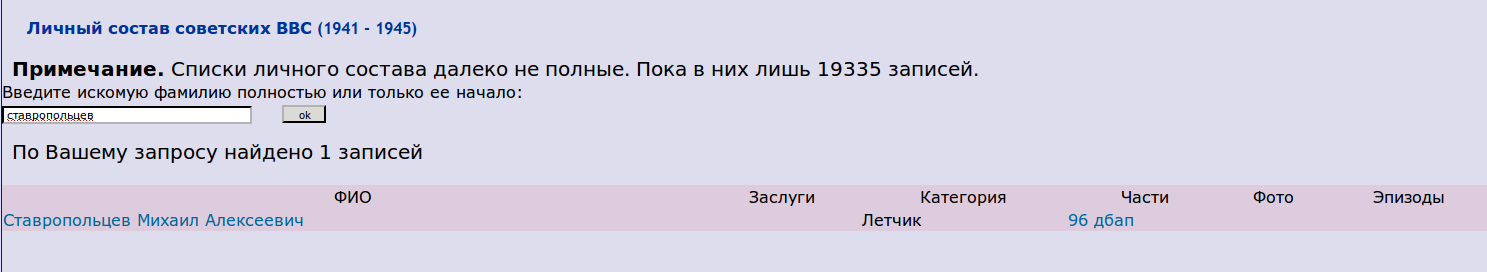 Номер записи 51520436 Фамилия Ставропольцев Имя Михаил Отчество Алексеевич Дата рождения __.__.1918 Место рождения Куйбышевская обл., Сызранский р-н, п. Журавлевка Последнее место службы 96 Ав. П 42 Ав. Д Воинское звание лейтенант Причина выбытия пропал без вести Дата выбытия 05.11.1941 Название источника информации ЦАМО Номер фонда источника информации 58 Номер описи источника информации 818883 Номер дела источника информации 983