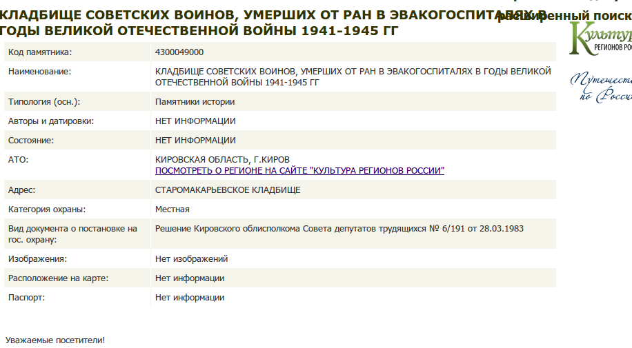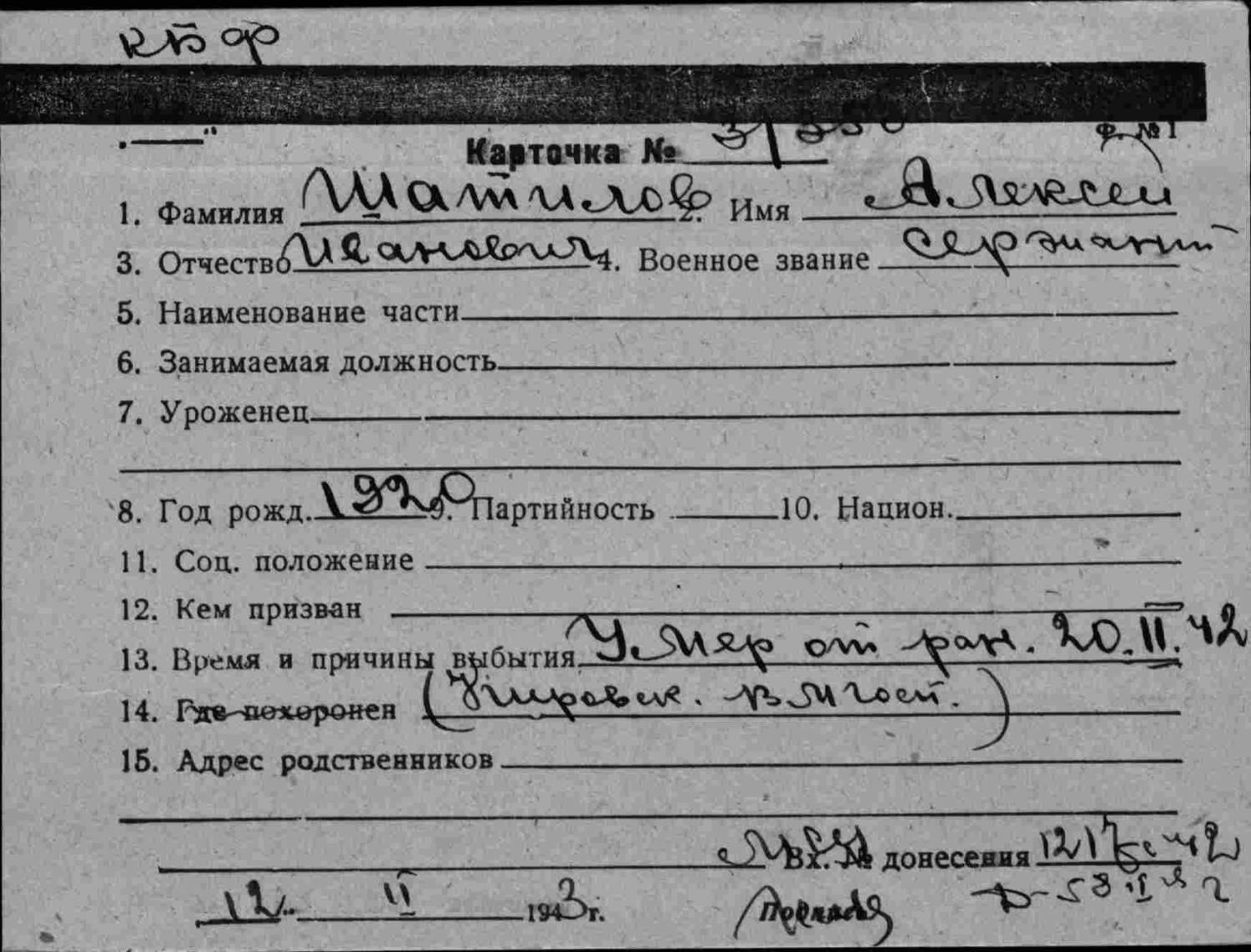 Quote (валсоря) Огромное спасибо за помощь!!!Хотелбы узнать место захоронения Шатилова Алексея Ивановича если это возможно.Ещё раз спасибо за помощь. Добрый вечер. Насколько видно из карточки, он служил на балтфлоте. Умер в Кировском госпитале. С тех пор многое изменилось, в том числе и наименования, но более вероятны два: Госпиталь ВМФ в гор. Киров, и госпиталь на территории Кировского завода в Ленинграде. В Кирове мало воинских захоронений. В основном это одиночные захоронения на городских кладбищах. А вот с Ленинградом - сложнее.