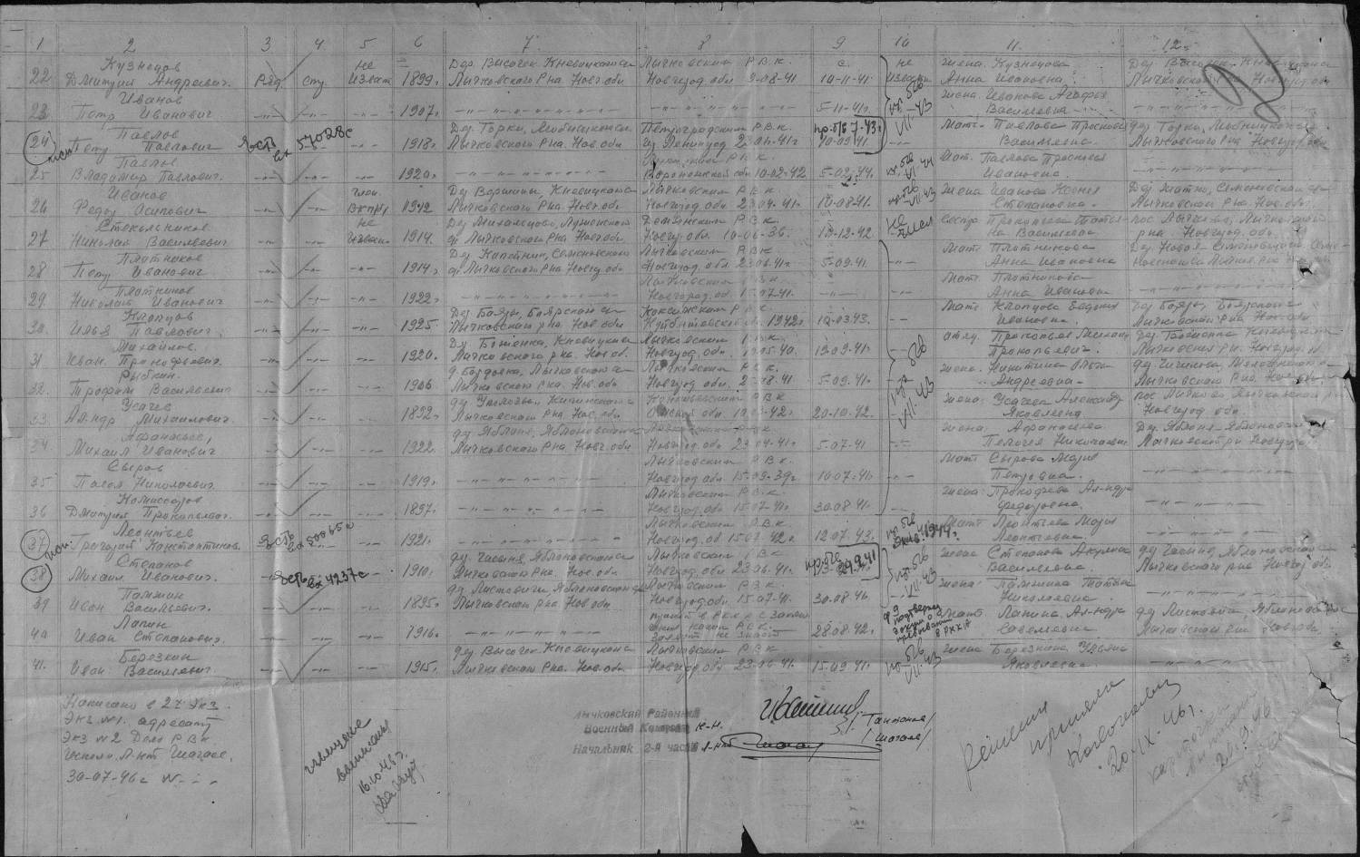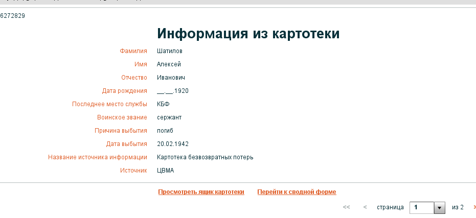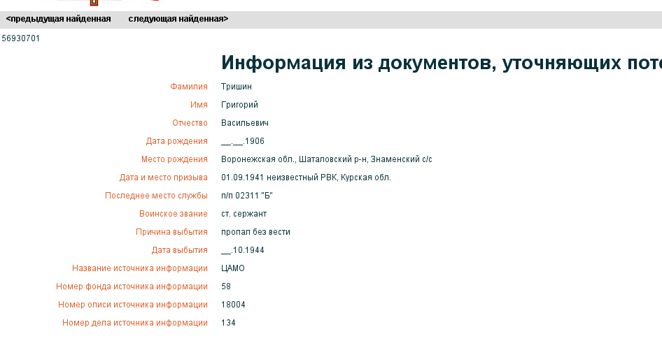 Quote (Снигирев) информация имеется , но сами архивные работники не горят желанием ее искать , раз им не указан номер военной части . Тогда остаётся только военный комиссариат по месту призыва. Но там тоже была какая-то путаница с архивами, вернее со сроками их хранения. Ваш случай, пожалуй, один из самых непростых. Насколько я знаю, архивы до начала войны еще массово не оцифровывались. Документы должны быть, поскольку место призыва не было фронтовой зоной. Но вручную найти их... очень трудно. Есть еще один вариант, только очень трудоёмкий, и , увы, тоже не очень надежный. Но мне таким образом удалось найти родственника моих друзей: При обращении к ОБД делать запрос не столь конкретный, может начинать только с фамилии, и из множества найденных выбирать более подходящее и проверять дальше. В примере с моим поиском оказалось, что неверными оказались год рождения и место призыва. По "нашим" документам человек не значился. Нашелся он только в базе военнопленных, причём с полными данными, включая дату пленения и место жительства мамы. С Уважением Тимофей