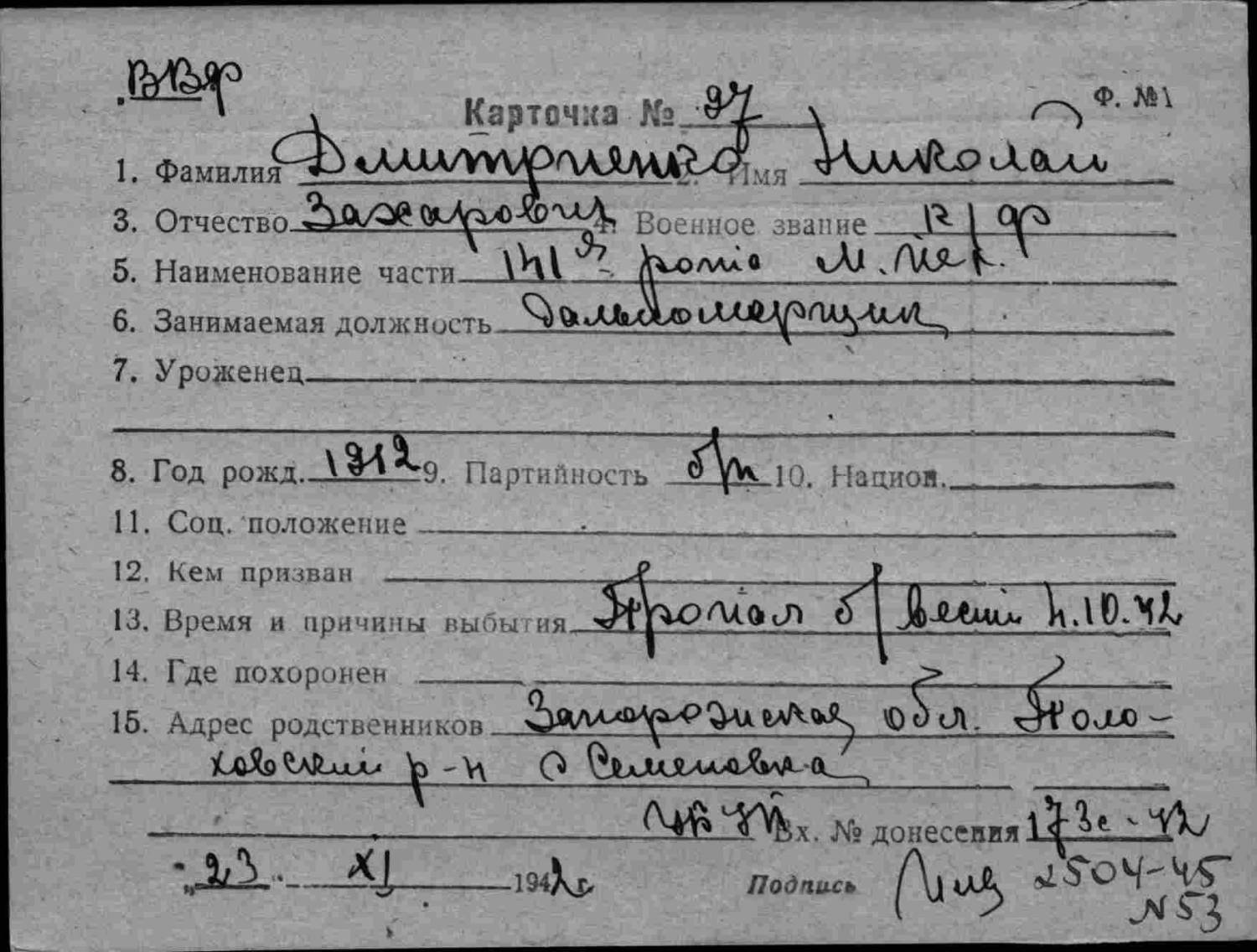 Здравствуйте! Хочу узнать боевой путь своего деда: Ларионов Алексей Григорьевич, 11.03.1910 г.р., уроженец хутора Фоминка, Криворожскогор-на, Ростовской обл. (в районе г.Миллерово), Мобилизован в ряды РККА 23.06.1941 г. С21.03.1943 по окончании курсов фототехников присвоено звание техник-лейтенант и назначен техником по фотооборудованию 955 штурмового авиационного полка 305 шад. 13.12.1943 исключен из списков полка иоткомандирован по болезни в РВК по месту жительства семьи (Справка врачебной комиссии Эвакогоспиталя №3174 (г.Магнитогорск) от 10.12.1943г.) На фотографии деда есть запись: 955 шап Конотоп 27.09.41 г.Чугуев 16.12.41 Целуйково август 41 г.Изюм 12.04.41 с.Буденовка Мой отец 1930 г.р. очень мало что знал и нам с братом рассказывал о своем отце (возможно дед не хотел травмировать психику своего сына (ему не было 17 лет) и не рассказывал о себе в войне). Я родился много позже после смерти моего деда, как говорила бабушка от ран (08.09.1947). Предполагаю, что мой дед с призыва и до демобилизации служил в 955 шап. Хотелось бы узнать боевой путь - кем служил мой дед и в каких званиях? Служил ли в других каких-либо полках и подразделениях? Где проходил обучение? От каких ранений был демобилизован? и прочую информацию. Спасибо заранее. С уважением Ларионов Игорь Анатольевич.