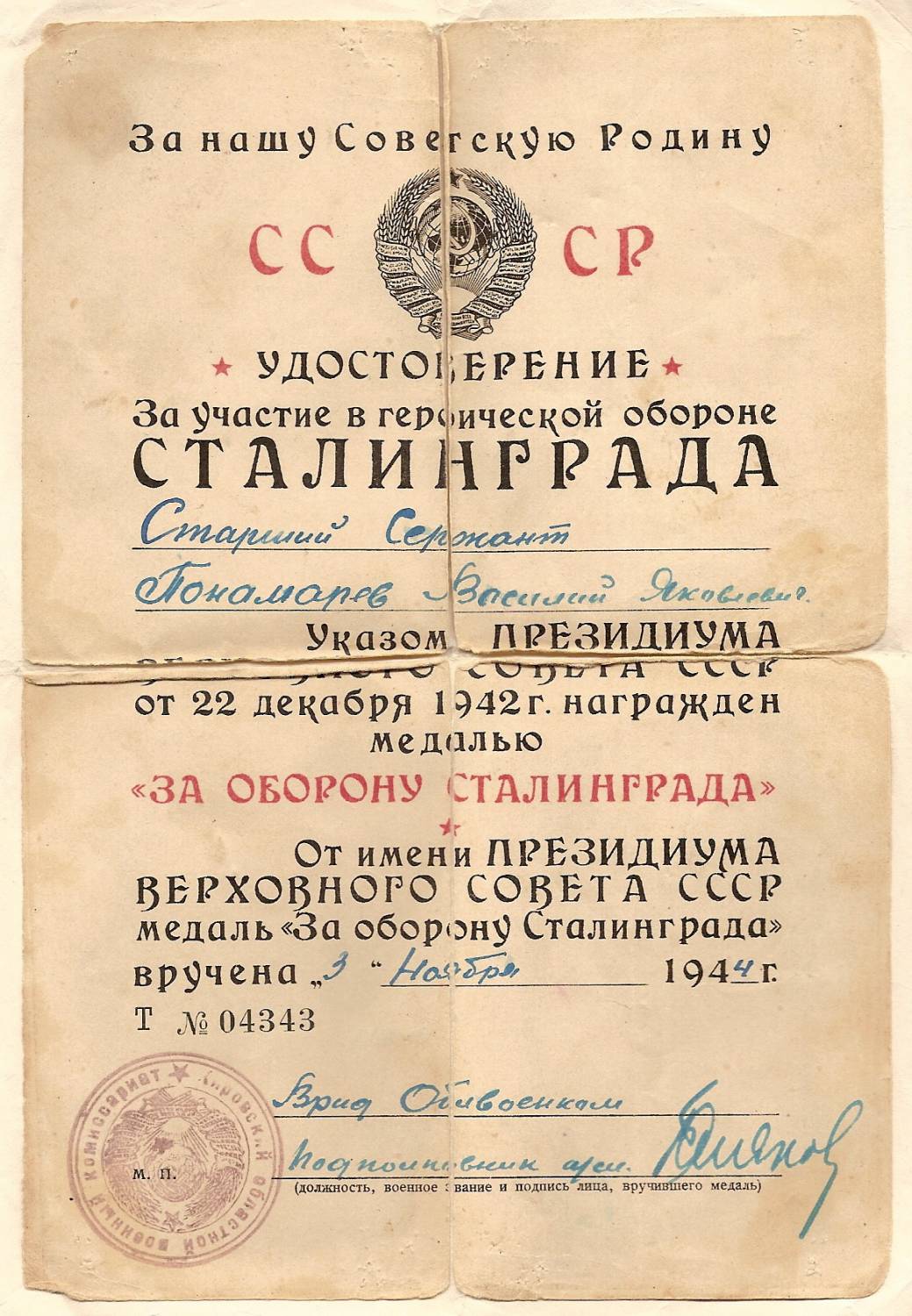 Здравствуйте! Я хотел бы узнать о боевом пути своего деда старшего сержанта Пономарева Василия Яковлевича 1904 г.р. Единственное, что у меня осталось это медаль "За оборону Сталинграда" и медаль "За отвагу" и удостоверения к ним. Буду благодарен за любую информацию. Заранее спасибо за обратную связь.