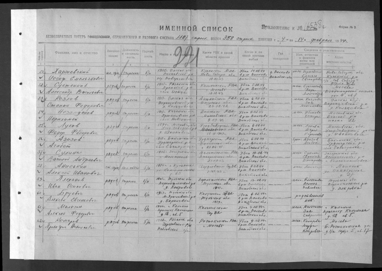 Quote (AS) Добрый день! Обращается внук солдата погибшего в Великой Отечественной Войне. На моего дедушку Сухину Василия Андреевича 1906 г.р. с войны пришло две похоронки. По первой он погиб 10.02.44 в Витебской области , а по второй - умер от ран 22.12.44 в Чехословакии. Данные подтверждаются ОБД Мемориал. В деревне Старое Село Витебской обл. его имя увековечено на мемориальной доске. Есть фотогафия на которой сфотографирован мой дед в двоем с красноармейцем. На ее обратной стороне с трудом, но можно прочитать дату фотографии 25.08.44 и фамилию его товарища - Матвеев Пантилей Филиппович гр 1910. Возможно ли проследить где же всетаки закончился боевой путь моего дедушки. Получение нескольких похоронок на одного человека было более или менее частым явлением. При этом потом человек мог ещё и вернуться с войны живым. Если у вас есть фото с августовской датой 1944 г., то не приходится сомневаться, что он не погиб в феврале 1944-го, а провоевал до декабря, был ранен и умер от ран.