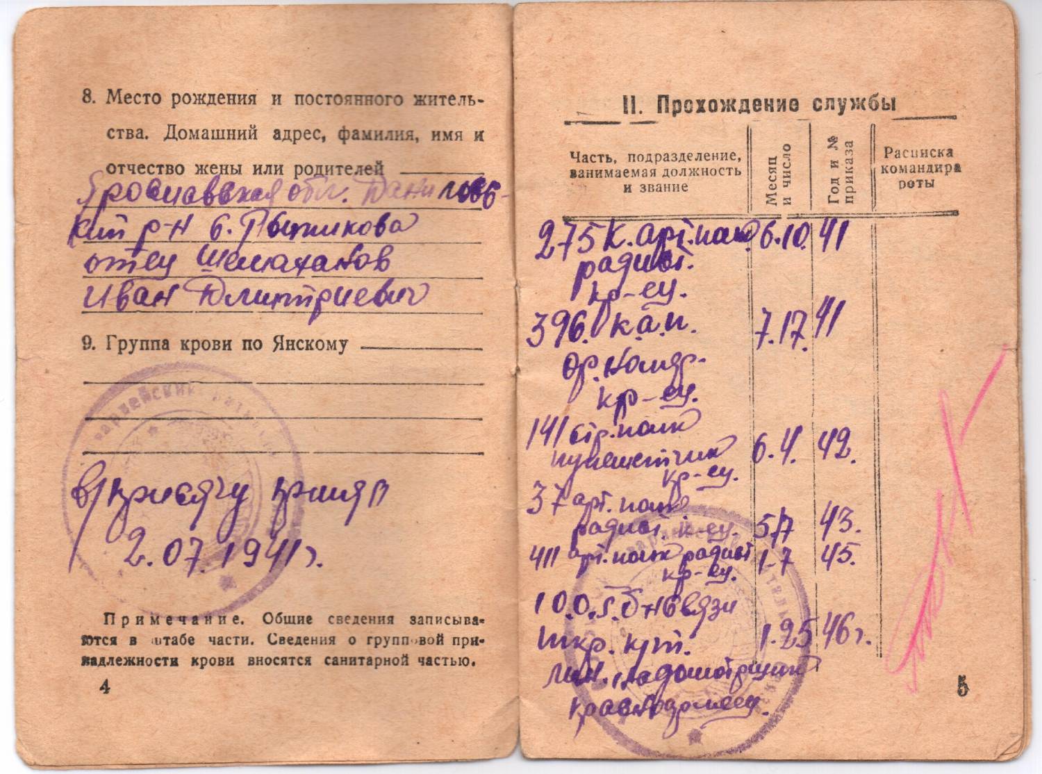 Здравствуйте, хочу узнать обоевом пути моего деда, Шемаханова Павла Ивановича 1917 г.р. Имеется красноармейская книжка, где в графе "Прохождение службы" есть следующие записи: 275 кап радист 10.06.41; 396 кап ор. номер 17.07.41; 141 сп пулеметчик 04.06.42, 37 арт полк радист 07.05.43; 411 арт полк радист 07.01.45; 10 гв (?) бн связи 25.01.46. Ничего толкового собрать не смог, данные разнятся.