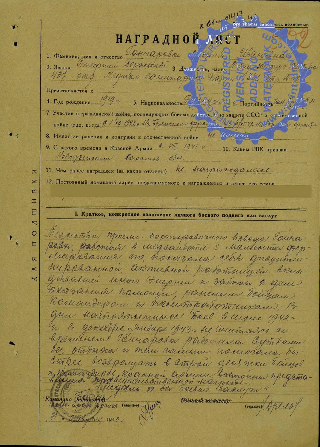 Quote (Анд73) Её зовут Гончарова Мария Ивановна 1919 г.р. Воевала в 40 Армии 2 Украинский фронт, прошла всю Европу, говорила что есть медаль За отвагу, но ни медали, ни документов не сохранилось Гончарова Мария Ивановна год рождения __.__.1919 ст. сержант в РККА с __.08.1941 года место призыва: Новоузенский РВК, Саратовская обл., Новоузенский р-н На момент награждения Ваша бабушка воевала в 346 сд в составе 3 гв. армии Юго-Западного фронта. ПРИКАЗ ВЕРХОВНОГО ГЛАВНОКОМАНДУЮЩЕГО Генерал-полковнику Толбухину Генералу армии Малиновскому Войска Южного и Юго-Западного фронтов в результате умелого маневра и стремительного наступления одержали крупную победу в Донецком бассейне над немецкими захватчиками.; Сломив сопротивление врага, наши войска в течение шести дней с боями овладели городами Дебальцево, Иловайск, Лисичанск, Енакиево, Горловка, Чистяково, Славянск, Артемовск, Краматорская, Константиновка, Макеевка, Красноармейское, Ясиноватая и областным центром Донбасса – городом Сталино. Таким образом, войска Южного и Юго-Западного фронтов отбили у немцев и вернули нашей Родине Донецкий бассейн – важнейший угольный и промышленный район страны. В боях за Донбасс отличились войска генерал-лейтенанта Цветаева, генерал-лейтенанта Крейзера, генерал-лейтенанта Лелюшенко, генерал-лейтенанта Захарова, генерал-майора Жеребина, генерал-майора Маковчук, генерал-майора Белова, генерал-майора Рослого, летчики генерал-лейтенанта авиации Судец, генерал-лейтенанта авиации Хрюкина и особенно 126-я стрелковая дивизия полковника Казарцева, 127-я стрелковая дивизия полковника Крымова, 271-я стрелковая дивизия полковника Говорова, 346-я стрелковая дивизия генерал-майора Станкевского, В ознаменование одержанной победы отличившимся в боях за овладение Донбассом соединениям и частям присвоить наименования: “Дебальцевской” – 346-й стрелковой дивизии В знак торжества по случаю крупной победы в Донбассе сегодня, 8 сентября, в 20 часов столица нашей Родины Москва от имени Родины салютует нашим доблестным войскам, освободившим Донбасс от немецких захватчиков, двадцатью артиллерийскими залпами из двухсот двадцати четырех орудий. За отличные боевые действия объявляю благодарность всем руководимым Вами войскам, участвовавшим в освобождении Донбасса. Вечная слава героям, павшим в борьбе за свободу и независимость нашей Родины! Смерть немецким захватчикам! Верховный Главнокомандующий Маршал Советского Союза И. СТАЛИН 8 сентября 1943 года, № 9 По этой дивизии в интернете оч.много информации,есть музей дивизии. В скане смотрите наградной лист Вашей бабушки медалью "За боевые заслуги": Добавлено (22.02.2011, 17:27) ---------------------------------------------