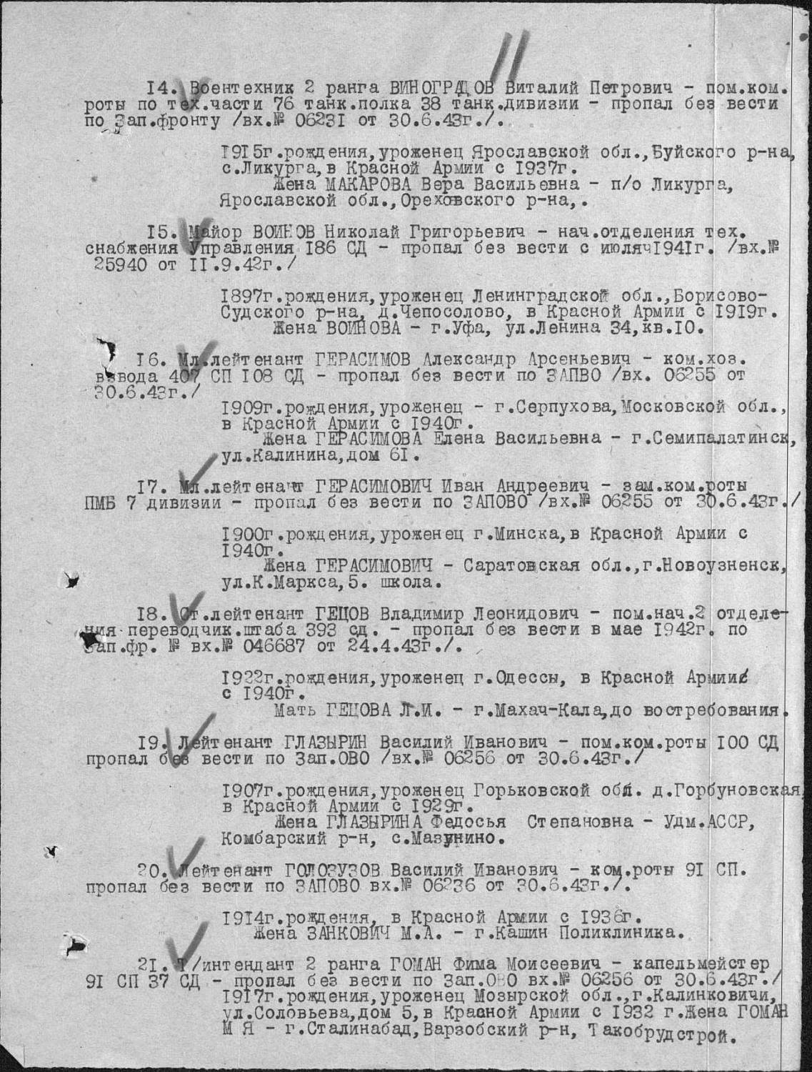 Quote (Наталия84) Ищу любую информацию о своем прадеде. Воинов Николай Григорьевич, 1897 года рождения, родился Ленинградская обл., Борисово-Судский р-н, д. Чепосолово, был призван в 1919 году, был майором. Последнее место службы 186 СД. Очень хочется узнать хоть какую-то информацию о нем и о его захоронении. Судя по записям на ОБД, ваш прадед не вышел из окружения, в которое попала дивизия в июле 1941 г. Захоронения в данном случае могло и не быть. Из журнала боевых действий 186 СД (238, 290 и 298 сп - это полки дивизии) 5-6 ИЮЛЯ 41г. Части 186 сд выгрузились на ст. Сиротино и заняли оборону: 298 сп - Улла-Кордон, по северному берегу реки Зап. Двина и предмостное укрепление в районе южнее Уллы 290 сп - обороняется в районе Бешенковичи 2 батальон 238 сп с батареей ПТО, батареей 76 мм пушек - ударная группа дивизии в районе южнее Мясоедово. Первый бой был дан 3 батальоном 298сп у предмостных укреплений. 4.7.41г. в 16.00 первые мотоциклисты, танки и бронемашины противника у моста через р. Зап. Двина были встречены орудийным и ружейно-пулеметным огнем. Мотомехколонна противника откатилась назад. Упорный бой длился до 3:00 5.07.41г., когда 3 батальон 298 сп начал отходить на Восточный берег р.Зап.Двина, взорвав за собой железный мост. 7 ИЮЛЯ 41г. В 12.00 после артминподготовки, под прикрытием 80 бомбардировщиков противник начал форсировать р.Зап.Двина с целью окружения частей дивизии. 298сп трижды отбрасывал противника в реку, но будучи окружён, вынужден отходить на промежуточный рубеж. В одной из контратак полка тяжело ранен командир полка полковник Волков и смертью героя пал начальник штаба капитан ЗЕЛЕНЦОВ, который раненный был окружён и последним выстрелом из пистолета покончил жизнь самоубийством. Ударная группа полка в составе двух стрелковых и пулемётного взвода 4 роты под командованием капитана-Гришина отбрасывает у хутора Андриевские части противника, чем обеспечивает отход полка на промежуточные позиции. Ими уничтожено до двух рот пехоты противника. К 20:00 ударная группа в составе одного батальона, батареи 76мм орудий и батареи ПТО заняла отсечные позиция на рубеже дальние Осадки, Корнески, Мосты. В ночь с 7 на 8.07.41г. Лепельское минометное училище без приказа оставило передний край обороны - левый фланг 290сп остался открытым. Трижды вводя ударную группу в контратаку 290сп в районе Бешенковичи сбрасывал противника в р. Зап. Двина, но открытый фланг и подошедшие резервы противника не дали возможности закрепиться на берегу. 9 ИЮЛЯ 41г. Полк получил приказ отойти на новый рубеж. В боях 8.07,41г. полк потерял до 40% личного состава и до 40% уничтожено матчасти. В бою ранено два командира батальона капитаны Доценко и Жевлаков, пропал без вести военком полка - батальонный комиссар Денисов и начальник штаба капитан Савельев. Героической смертью погиб командир 1 пульроты мл. лейтенант ЯГУПОВ, который прикрывал фланг полка. Командир 1 дивизиона 327ап капитан Пашкин будучи тяжело ранен в голову, до конца боя оставался в строю и маневрированием огня сдерживал противника, чем обеспечил выход 290сп. С утра 8.7.41г. на правом фланге дивизии начался ожесточённый бой. Мотомехколонна противника, двигаясь вдоль шоссе м.Улла-Мясоедово, повела наступление на передний край обороны 238сп, который поддерживал 1 и 2 дивизион 446 гап. В первые минуты боя командир батареи мл.лейтенант Ломов своей батареей уничтожил 6 танков и 2 бронема