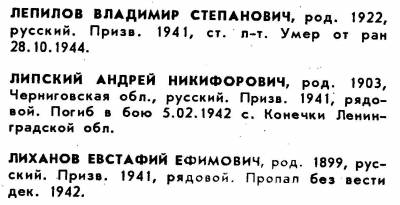 Здравствуйте, всей нашей семье очень хотелось бы узнать о судьбе моего прадеда. Все время нам говорили, что он пропал без вести во время ведения боевых действий под Сталинградом. Но по материалам ОБД-мемориал удалось выяснить, что он, Липский Андрей Никифорович, погиб в бою 05.02.1942г. в с. Конечки Ленинградской обл. Информация взята из книги Памяти, Алтайский край (страница прикреплена). По дате призыва, дате рождения, совпадает с информацией от бабушки, да и по Алтайскому краю это единственный вариант. Говорили также, что был связан с кавалерией. Жили они на тот момент в с. Тюменцево Алт.края. Очень хотелось бы узнать где захоронен, где служил и т.д. Я учусь в ВВУЗе (курсант) в Спб и очень хочу довести до конца поиск, найти место захоронения. Искренне надеюсь на вашу помощь. С уважением Александр.