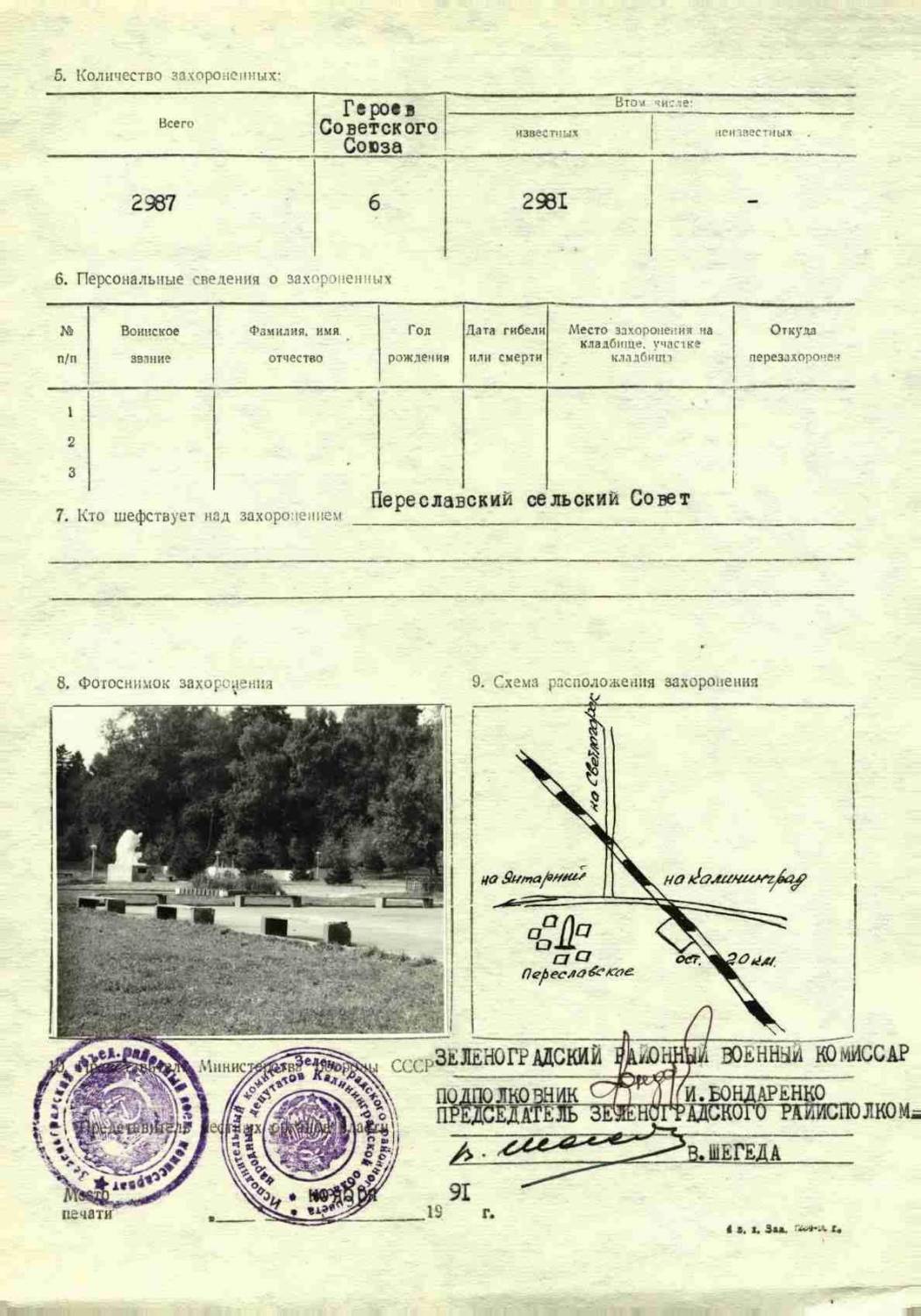 Quote (rekrut-78) Добрый день.уважаемые посетители и админ у меня большая просьба помочь установить по возможности всю информацию(где именно захоронен,боевой путь,награждения...)моего деда.Бутырин Александр Михайлович 1902 г.р.призван на фронт в 1941г. усть-кубенским р.в.к.погиб 9апреля 1945года при штурме кенингсберга. заранее огромное спасибо. Номер записи 8718814 Фамилия Бутырин Имя Александр Отчество Михайлович Дата рождения __.__.1902 Место рождения Вологодская обл., Усть-Кубинский р-н Дата и место призыва Усть-Кубинский РВК, Вологодская обл., Усть-Кубинский р-н Последнее место службы 277 СД 854 СП Воинское звание красноармеец Воинская должность Причина выбытия убит Дата выбытия 09.04.1945 Место выбытия Первичное место захоронения Госпиталь Родственники Доп. информация Название источника информации ЦАМО Номер фонда источника информации 58 Номер описи источника информации 18003 Номер дела источника информации 1040 Номера листов источника информации 277 трелковая дивизия входила в состав 5 армии,с 13 января 1945 г. армия участвовала в Восточно-Прусской (13 января — 25 апреля) стратегической операции, в ходе которой во взаимодействии с другими армиями фронта разгромила тильзитско-инстербургскую и хальчбергскую группировки противника и 23 января овладела г. Инстербург. На завершающем этапе войны она участвовала в ликвидации группировки противника на Земландском полуострове. Захоронен: Бутырин Номер записи 260444616 Фамилия Бутырин Имя Александр Отчество Михайлович Дата рождения/Возраст __.__.1902 Воинское звание рядовой Дата смерти 09.04.1945 Страна захоронения Россия Регион захоронения Калининградская обл. Место захоронения Зеленоградский р-н, п. Переславское Могила Братская могила Откуда перезахоронен н. п. Приллакен Т.е сначала был похоронен в Прилякен(Приллакен) а впоследствии перезахоронен в п.Переславское. Фото братской могилы (старое и новое)в сканах:
