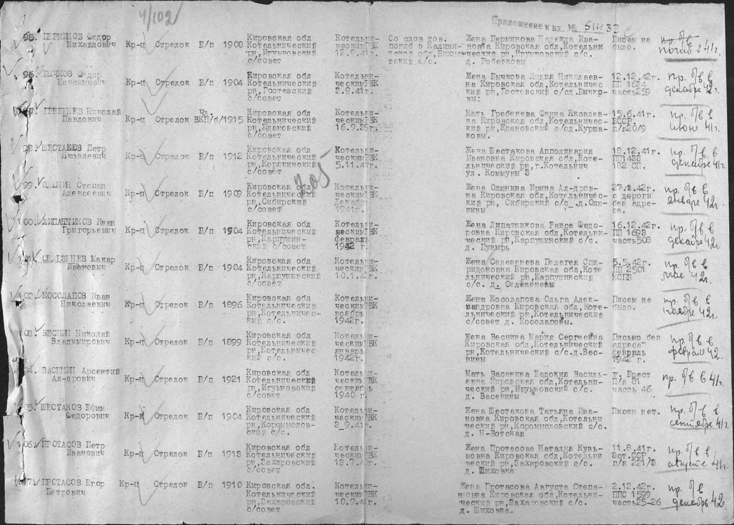 Здравствуйте! В разделе "поиск могил и захоронений" я уже указала все данные (какие мне известны) о своем дедушке, солдате, погибшем 4 ноября 1942 года. Очень хочу узнать всю его солдатскую судьбу. Где воевал, его звание, как погиб - в бою ли или умер от ран, где похоронен. Его сын (мой отец) был ребёнком и мало помнил отца, который ушёл на фронт из г. Ленинграда и проживал по адресу: ул. Воинова дом 54, кв. 10. В блокаду все те, кто мог что-либо рассказать о нём - умерли. Отец остался сиротой. Отец делал запрос и получил справку из Ждановского Районного Военного комиссариата г. Ленинграда от 1 ноября 1954 года со следующим содержанием: Дана настоящая гр-ну Осипову Анатолию Ивановичу в том, что его отец солдат Осипов Иван Васильевич, 1902 г. р., находясь на фронте в период Великой Отечественной войны погиб 4 ноября 1942 г. Основание: книга извещений №7 - 1947 г. Очень скупая и недостаточная информация. Такую и давали в те годы. На вашем сайте прочитала, что сведения есть даже о родителях солдата, жене - тех, кому посылать похоронку. Вот и о родителях тоже хотелось бы узнать, потому что отец не помнит имя своей бабушки, которую отвёз сам на кладбище на саночках, умершую от голода. Благодарю, низкий вам поклон, дорогие! С праздником. Будьте счастливы.