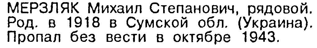 Номер записи 405129334 Фамилия МЕРЗЛЯК Имя Михаил Отчество Степанович Дата рождения __.__.1918 Дата выбытия __.10.1943 Название источника информации Книга памяти. Хабаровский край. Том 2