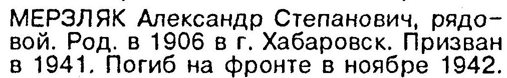Номер записи 405129335 Фамилия МЕРЗЛЯК Имя Александр Отчество Степанович Дата рождения __.__.1906 Дата выбытия __.11.1942 Название источника информации Книга памяти. Хабаровский край. Том 2