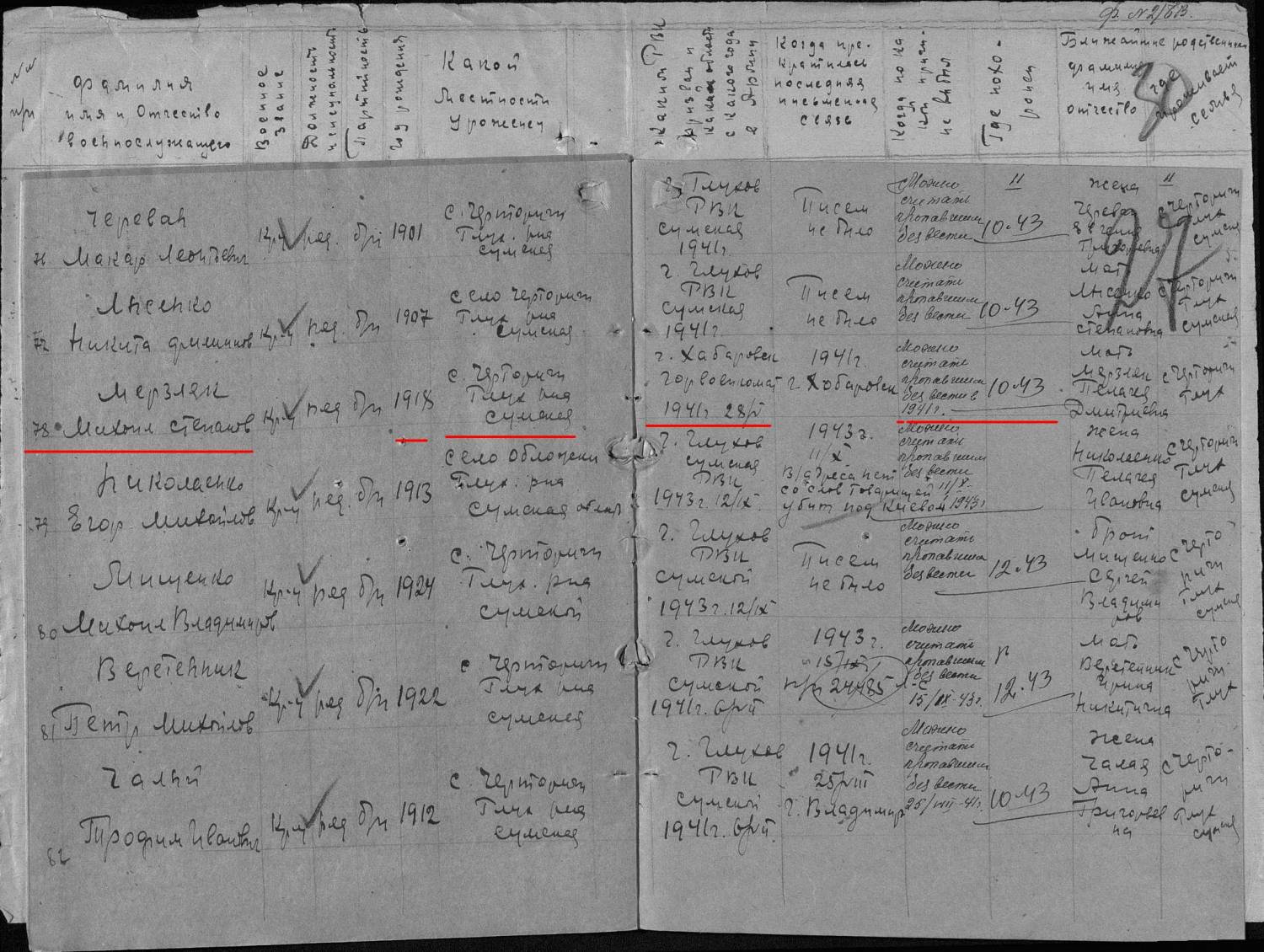 Помогите разыскать информацию о пропавших безвести Мерзляк Александр Степанович рядовой родился в 1906г г Хабаровск призывался в 1941 г погиб на фронте в ноябре 1942. Мерзляк Михаил Степанович родился в1918 г в Сум области(Украина) пропал безвести в октябре 1943