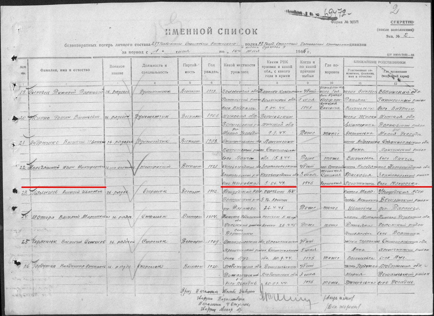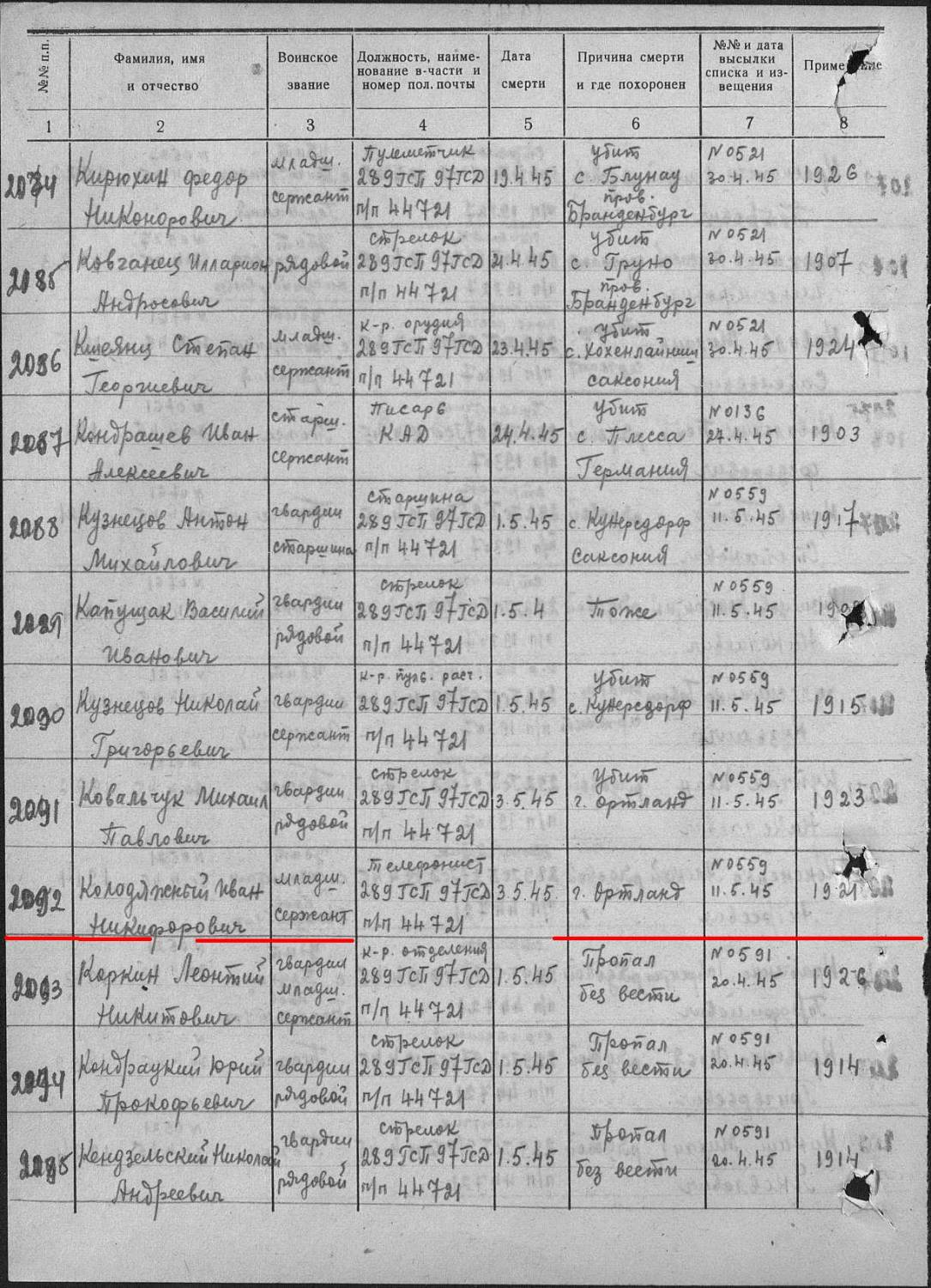 irenkacz20, Номер записи 63150866 Фамилия Колодяжный Имя Иван Отчество Никифорович Дата рождения __.__.1921 Последнее место службы 289 Гв. СП 97 Гв. СД Воинское звание мл. сержант Причина выбытия убит Дата выбытия 03.05.1945 Название источника информации ЦАМО Номер фонда источника информации 58 Номер описи источника информации 977525 Номер дела источника информации 276