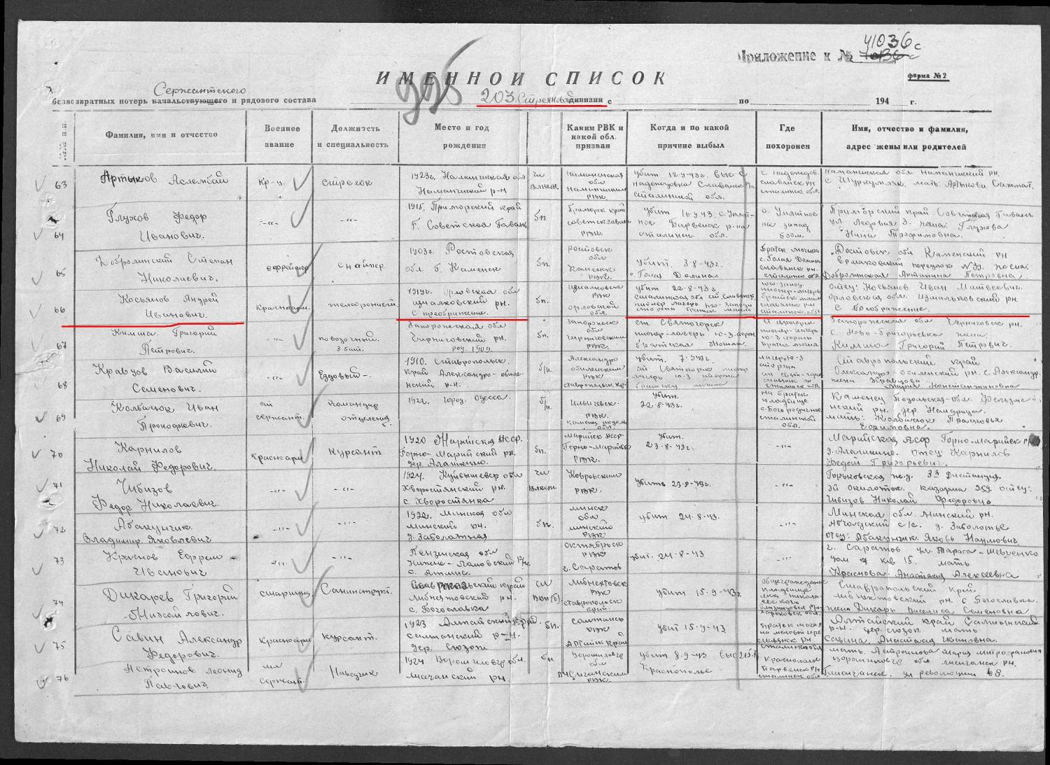 Номер записи 53850813 Фамилия Косьянов Имя Андрей Отчество Иванович Последнее место службы 1037 ап Воинское звание рядовой Причина выбытия умер от ран Дата выбытия 22.08.1943 Госпиталь 254 МСБ Название источника информации ЦАМО Номер фонда источника информации 58 Номер описи источника информации А-71693 Номер дела источника информации 1100