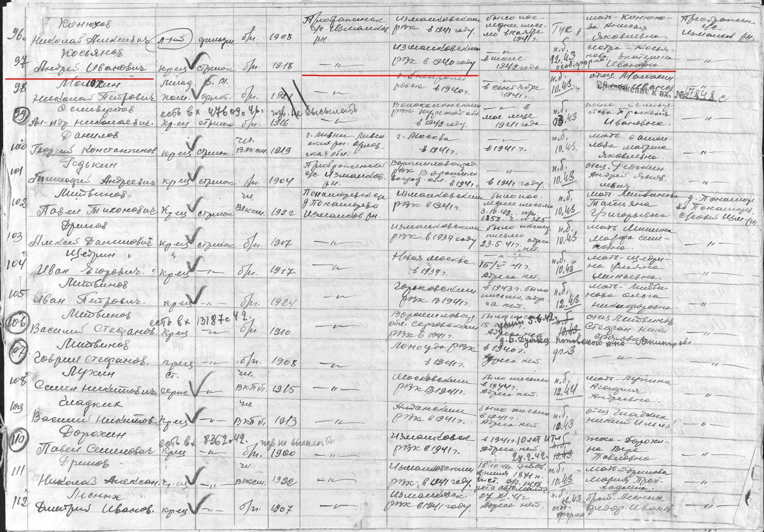 А есть такой еще вопрос у нас был второй дед который воевал и вернулся с войны Касьянов Федор Иванович 1905-1987 (брат Андрея) возможно как нибудь о нем тоже данные накопать?? и наградные листы или как правильно называется о его наградах ( у него есть орден вов 2-й степени, медаль за кенексберг, за японию, варшаву. О его военных подвигах родня уже тоже не вспомнит и времени много прошло те кто мог что трассказать уже умерли. Запрос в Липицкий военкомат делали ток там тишина...из за этого и в Цамо запрос нельзя отправить так как нет данных