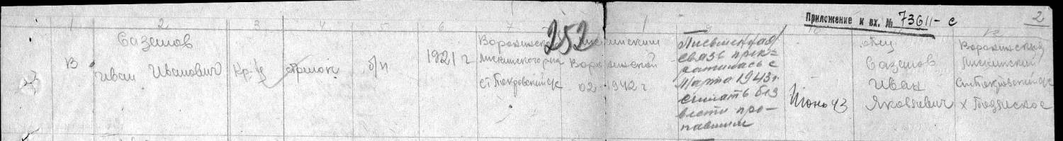 Svet1ana, Номер записи 57833866 Фамилия Сазанов Имя Иван Отчество Иванович Дата рождения __.__.1921 Место рождения Воронежская обл., Лискинский р-н, Ст. Покровский с/с Дата и место призыва __.02.1942 Лискинский РВК, Воронежская обл., Лискинский р-н Воинское звание красноармеец Причина выбытия пропал без вести Дата выбытия __.06.1943 Название источника информации ЦАМО Номер фонда источника информации 58 Номер описи источника информации 18004 Номер дела источника информации 469