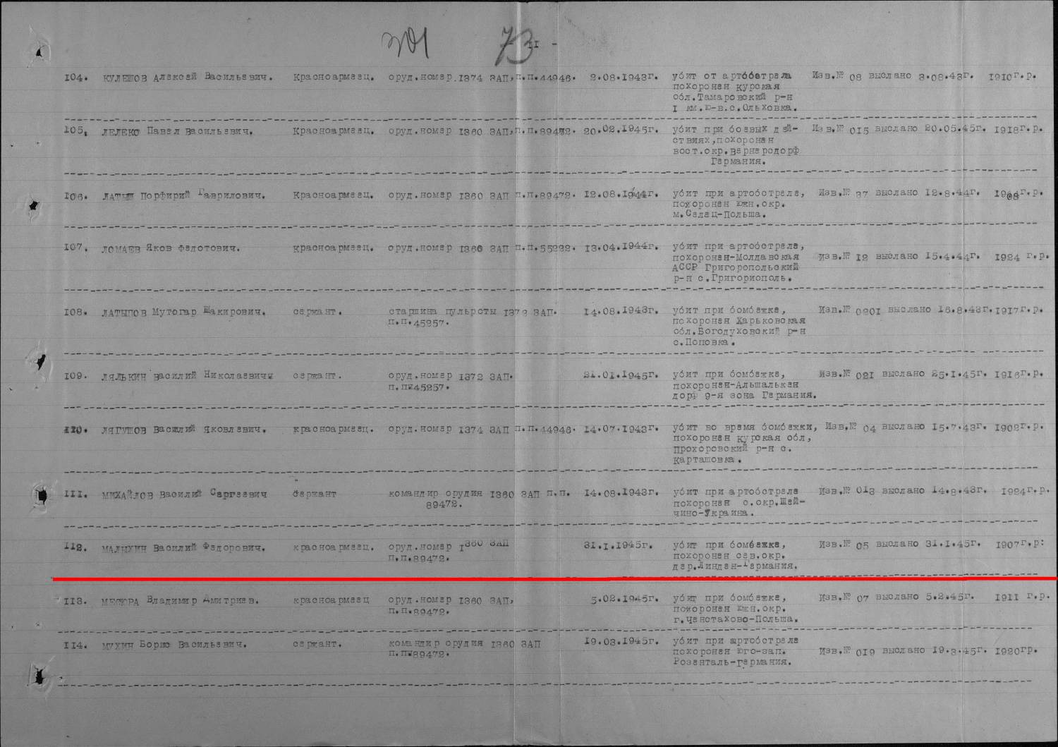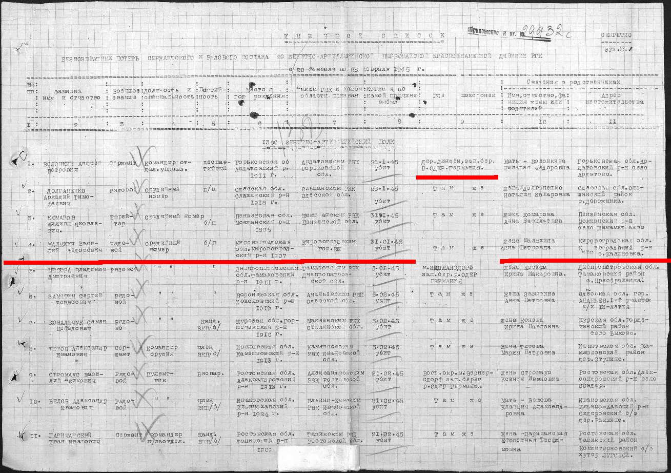 Малыхин Василий Федорович,1907 гр..,красноармеец,убит 31.01.45 г.,1360 ЗАП (зенитно-артиллерийский полк), ЦАМО : фонд 58 опись 977525 дело 274 --http://www.obd-memorial.ru/Image2/imagelink?path=0851c96e-35b9-4ae8-bc9e-646128b6b313 ЦАМО : фонд 58 опись 18003 дело 280 --http://www.obd-memorial.ru/Image2/imagelink?path=90cae0de-d7bf-48e3-b022-d56738cdd252