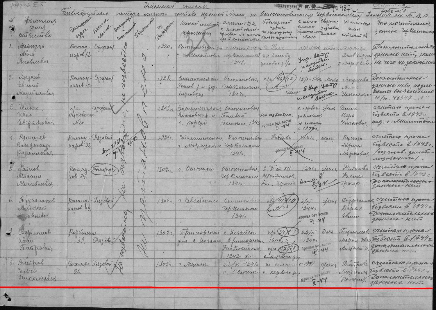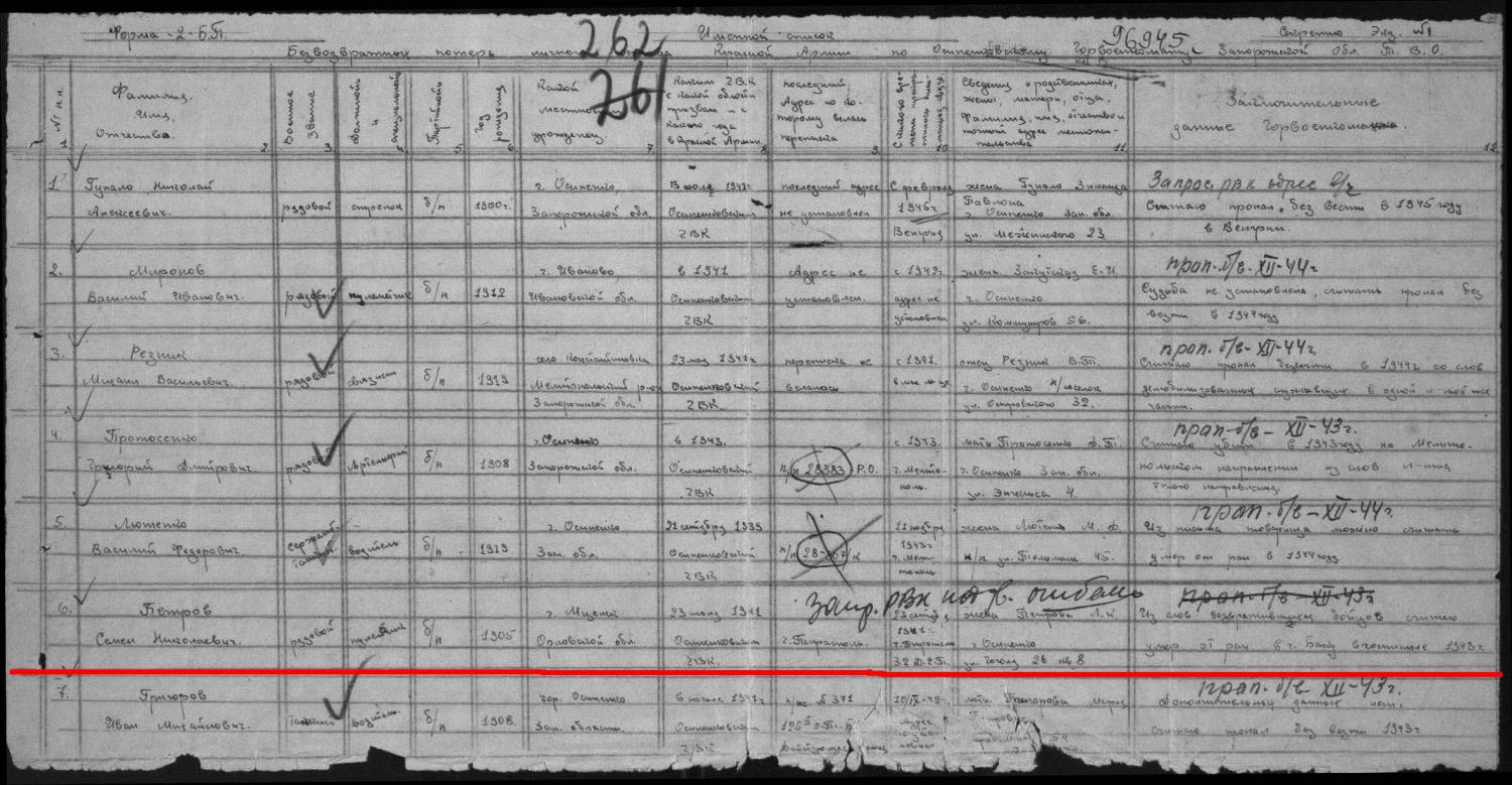 sumator, Номер записи 60159131 Фамилия Петров Имя Семен Отчество Николаевич Дата рождения __.__.1905 Дата и место призыва 23.06.1941 Осипенковский ГВК, Украинская ССР, Запорожская обл., г. Осипенко Воинское звание рядовой Причина выбытия пропал без вести Дата выбытия __.02.1944 Название источника информации ЦАМО Номер фонда источника информации 58 Номер описи источника информации 977520 Номер дела источника информации 97