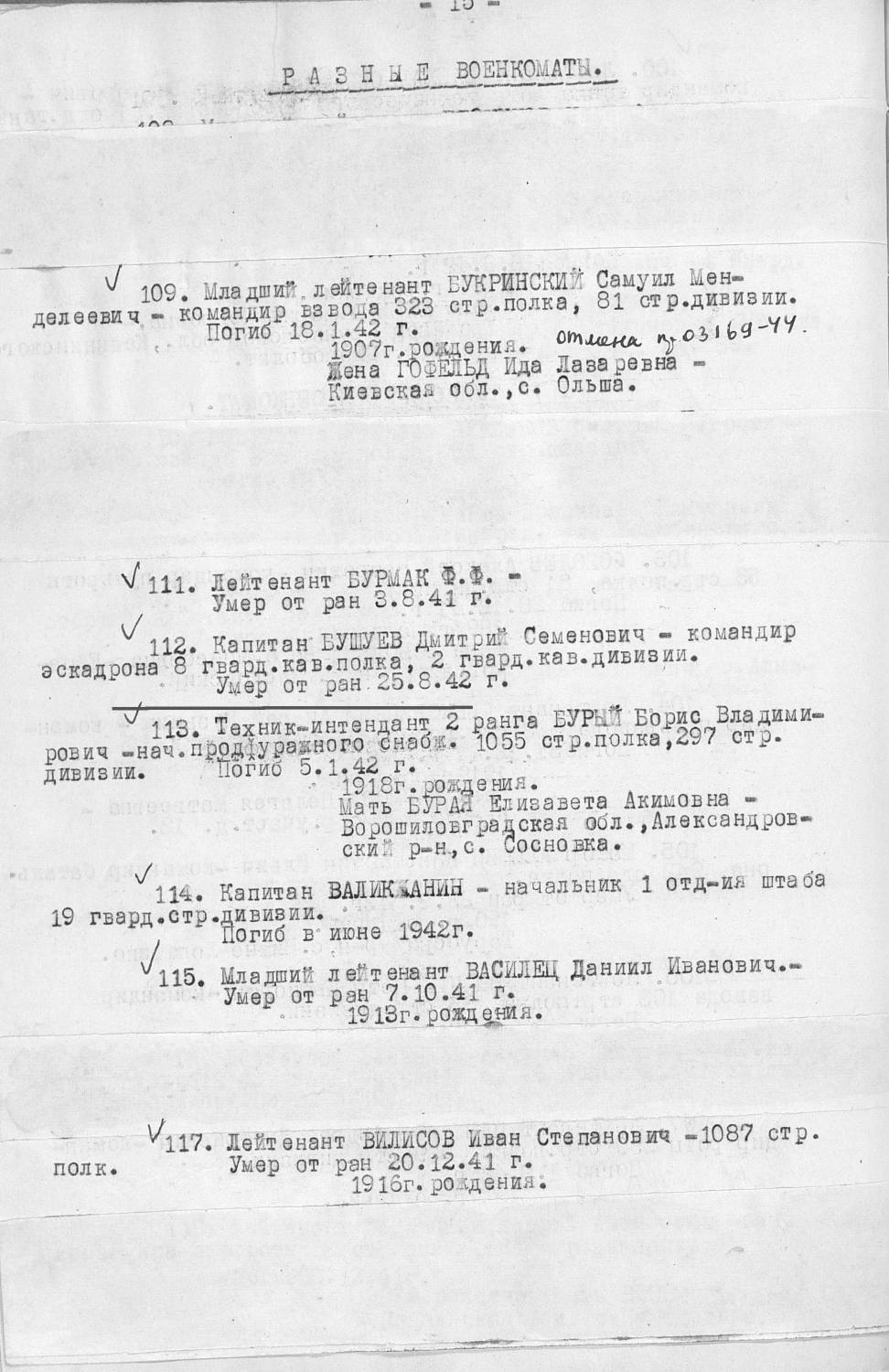 9VISHINKA9, большое спасибо! Не хочу показаться навязчивой, но учитывая Ваш опыт в деле поиска, прошу разрешить, по возможности, мои сомнения в этом вопросе. Дело в том, что в указанных документах 5746818.jpeg и 4953783.jpeg Бушуев Дмитрий Семенович числится убитым 23.08.1942 г. с местом захоронения в Козельском р-не. А в документах 9094601.jpeg, 1443759.jpeg - умер от ран 25.08.1942г. в Ульяновском р-не (место захоронения не указано). Кроме того, в книге памяти Калужской области я прочитала, что поисковые отряды производили перезахоронения, объединяя небольшие захоронения с более крупными. Структура книги памяти (некоторые тома можно найти в электронном виде) включает в себя подробные описания этих захоронений с указанием сведений о погребенных, которых удалось идентифицировать. Именно поэтому меня интересовало начало сообщения в книге памяти Калужской области в т.17 (как сообщает ОБД Мемориал), которое, вероятно начинается со стр.533 или 532, где, как я думаю, описывается само место захоронения. Но, к сожалению, я не нашла этого тома на сайтах, возможно он еще не внесен в электронном варианте. А посмотреть эти страницы в ОБД Мемориал мне тоже не удалось. Я, также как и Вы, видела страницу 534 (документ 1443759.jpeg) с указанием фамилии Бушуев Д.С.