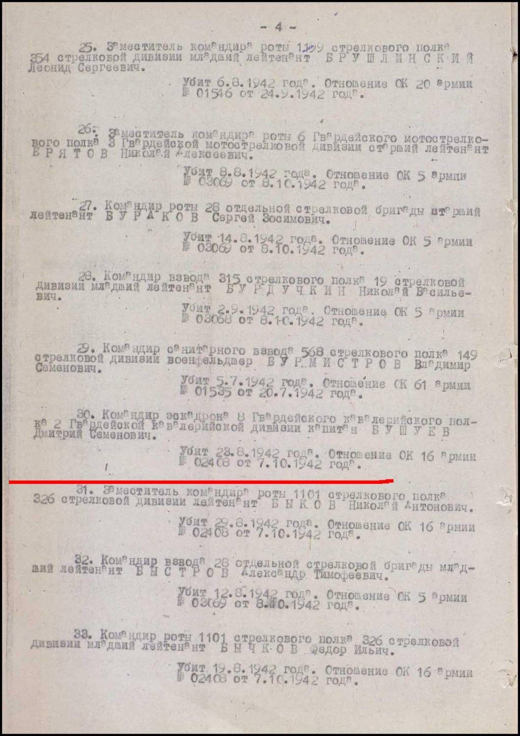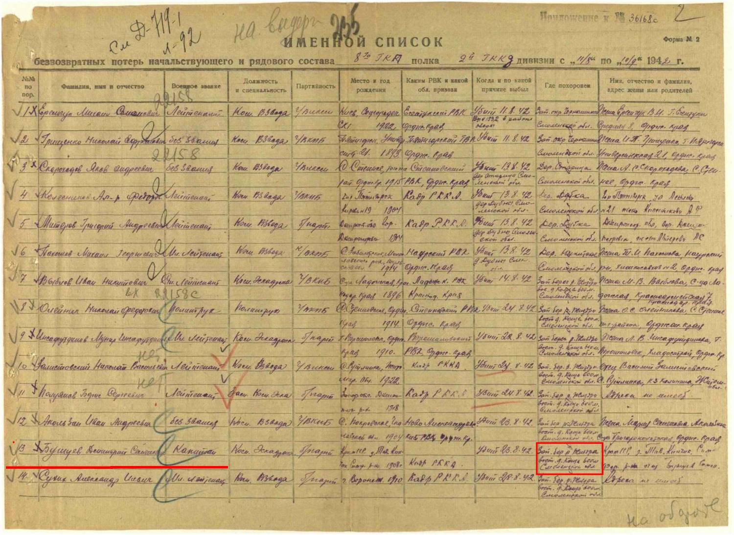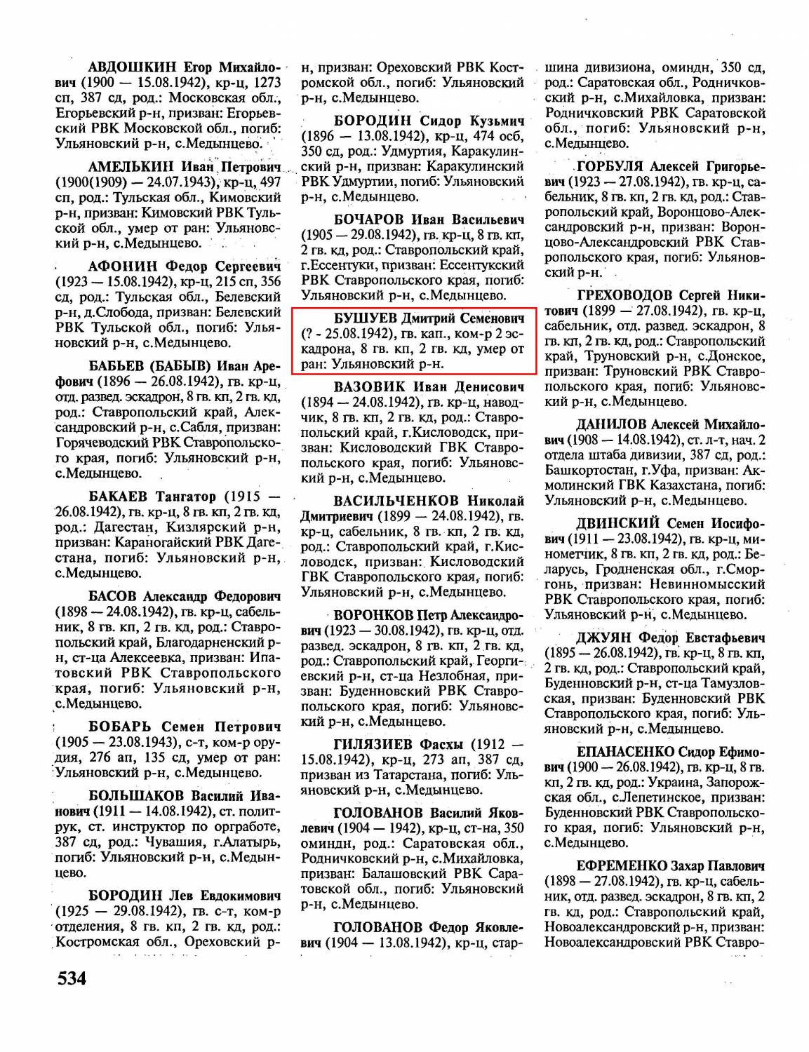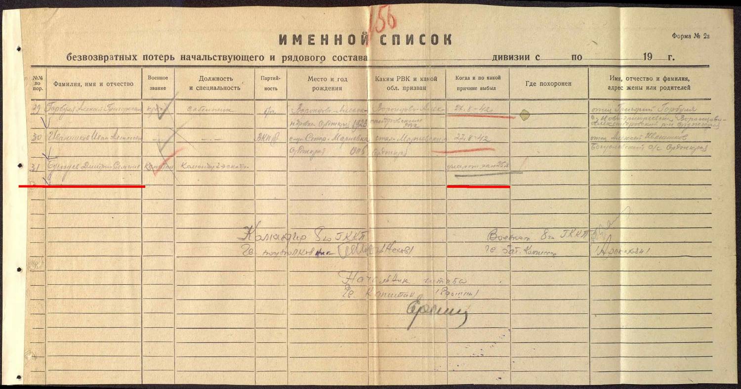 Здравствуйте! Помогите, пожалуйста, найти место захоронения моего деда, Бушуева Дмитрия Семеновича. В ОПБ Мемориал отыскала следующие сведения: Номер записи 9211787 Фамилия Бушуев Имя Дмитрий Отчество Семенович Последнее место службы 2 Гв. кав. див. 8 Гв. кав. полк Воинское звание капитан Причина выбытия умер от ран Дата выбытия 25.08.1942
