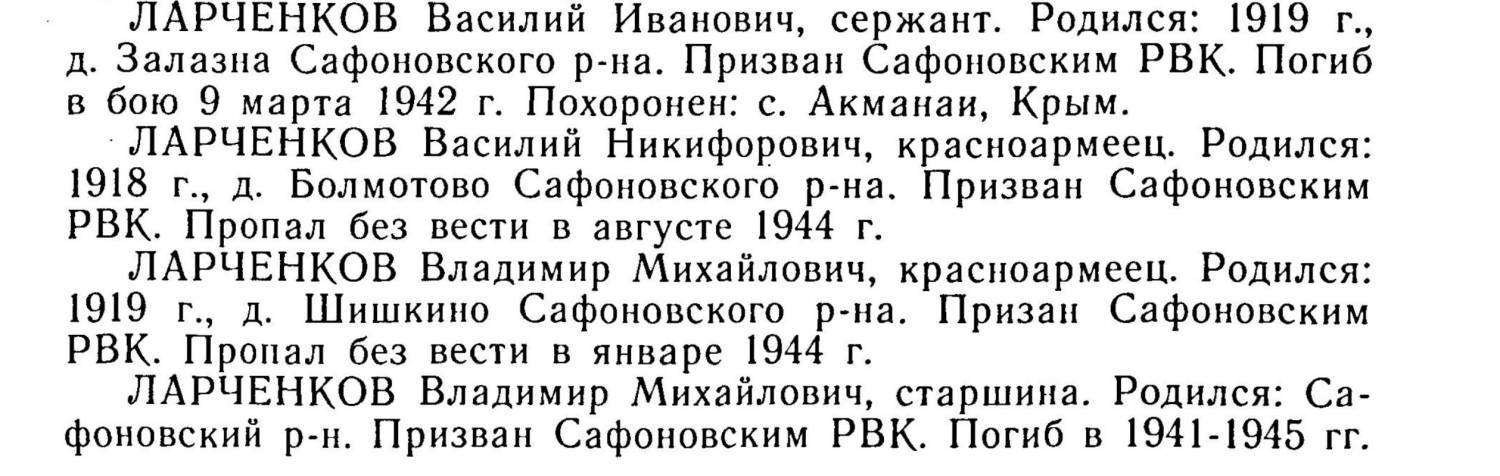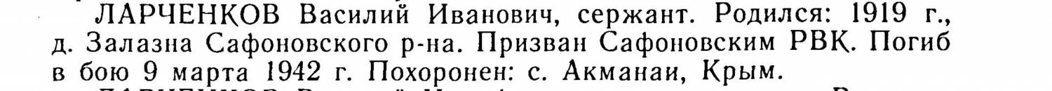 Помогите найти место захоронения деда - Ларченкова Василия Ивановича, 1919 г.р., уроженца д.Мужилово, Сафоновского р-на Смоленской области.