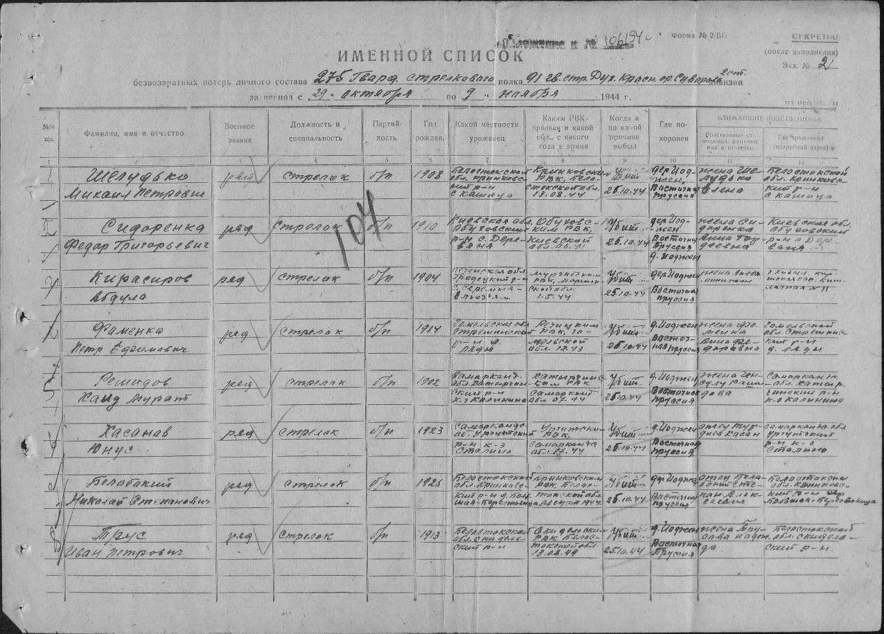 gaver, Номер записи 56796764 Фамилия Трус Имя Иван Отчество Петрович Дата рождения __.__.1913 Место рождения Белостокская обл., Скидельский р-н Дата и место призыва 13.08.1944, Скидельский РВК, Белорусская ССР, Белостокская обл., Скидельский р-н Последнее место службы штаб 91 Гв. сд Воинское звание рядовой Причина выбытия убит Дата выбытия 25.10.1944 Название источника информации ЦАМО Номер фонда источника информации 58 Номер описи источника информации 18002 Номер дела источника информации 1260