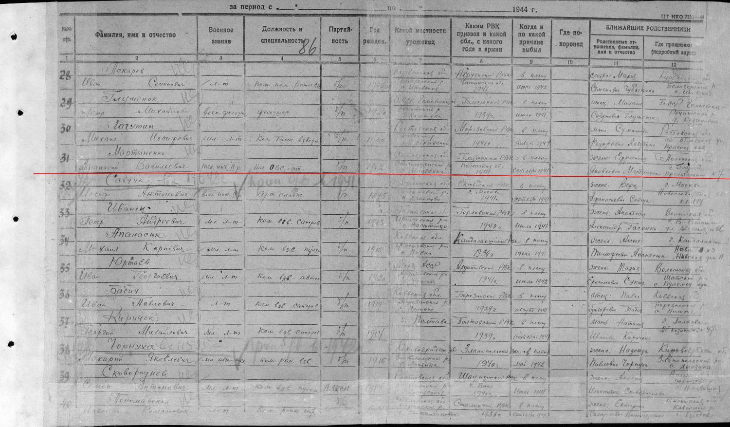 Дашенька, Номер записи 78466062 Фамилия Мартыненко Имя Афанасий Отчество Васильевич Дата рождения __.__.1902 Место рождения Смоленская обл., Стодолищенский р-н, д. Мадеевка Дата и место призыва __.__.1941 Глусский РВК, Белорусская ССР, Полесская обл., Глусский р-н Воинское звание техник-интендант 2 ранга Причина выбытия попал в плен (освобожден) Дата выбытия __.09.1941 Название источника информации ЦАМО Номер фонда источника информации 58 Номер описи источника информации 18002 Номер дела источника информации 1594