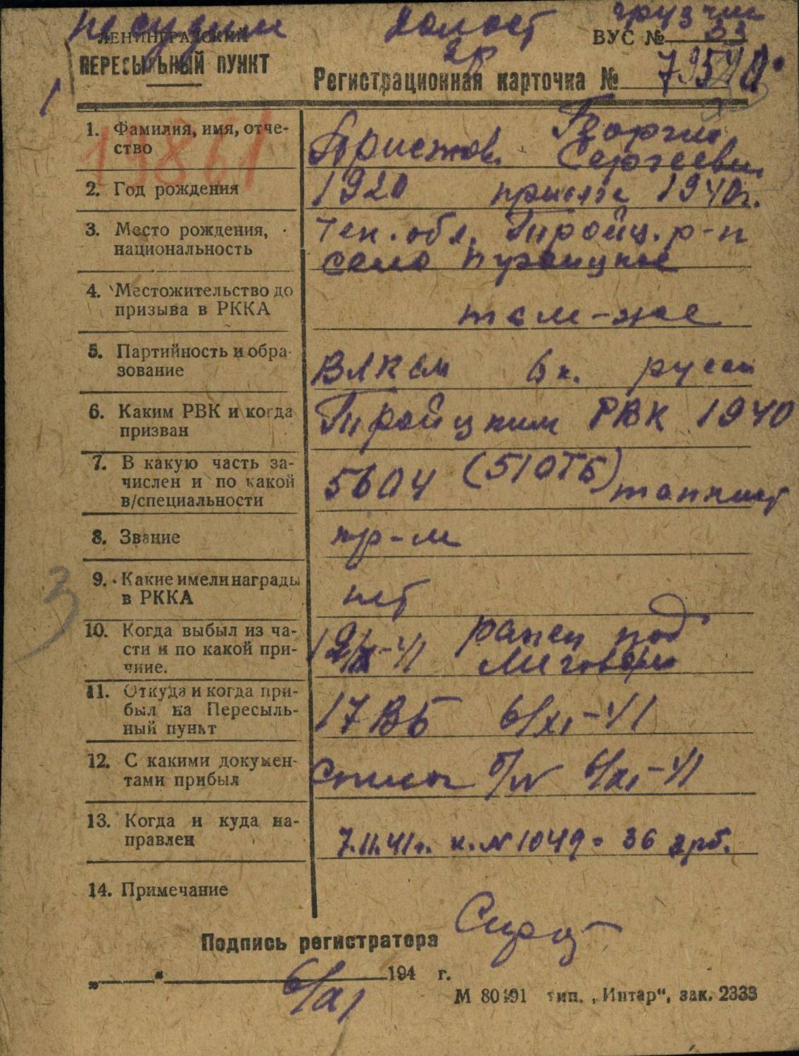 Здравствуйте, помогите найти места захоронений моего прадеда Аристова Алексея Сергеевича (1915 г.р.) и его родного брата Аристова Георгия Сергеевича (1920 г.р.). Оба родились и выросли в с. Троицком (возможно название Троицк, хотя более вероятно Троицкое) Троицкого р-на Чкаловской области (ныне Оренбургская обл.). Оба пропали без вести, писем не было. Жена Алексея, всю жизнь одна воспитывающая двоих малолетних детей, так и не дождалась его. На сайте obd-memorial.ru я нашла некоторую информацию, но она очень скудная. Пожалуйста, помогите хотя бы установить их судьбу! К сообщению прикрепляю 3 докумета: 1ый - Страница из Оренбургской Книги Памяти, где есть информация об обоих солдатах. 2-ой: "Документ, учитывающий безвозвратные потери", там указана информация об Аристовом Георгии Сергеевиче. 3-ий документ я нашла, НЕ указывая место рождения (с. Троицкое Троицкий р-н Чкаловской области). На сайте рядом с эти документом была указана та же информация, что и в документе, но вместо Чкаловской области указана Челябинская! Кроме нее все сходится! В оригинальном документе есть сокращение, то ли Чек., то ли Чел. У меня возник вопрос: может, создатели сайта ошиблись - уж слишком явно в этом сокращении просматривается К после Е.Это, конечно, ясно, что слово "Чкаловская" пишется без буквы Е после Ч. Но тем не менее мы не можем гарантировать 100% грамотность тех, кто заполнял оригинальный документ в военное время. Поэтому я в сомнении: относится ли этот документ, в котором совпадает ВСЕ кроме Чел. (или же Чкаловской) области, к Аристову Георгию Сергеевичу, или же в Челябинской области тоже есть такой же? Надеюсь на то, что Вас заинтересует моя история. Буду бесконечно благодарна Вам за ЛЮБУЮ ИНФОРМАЦИЮ!