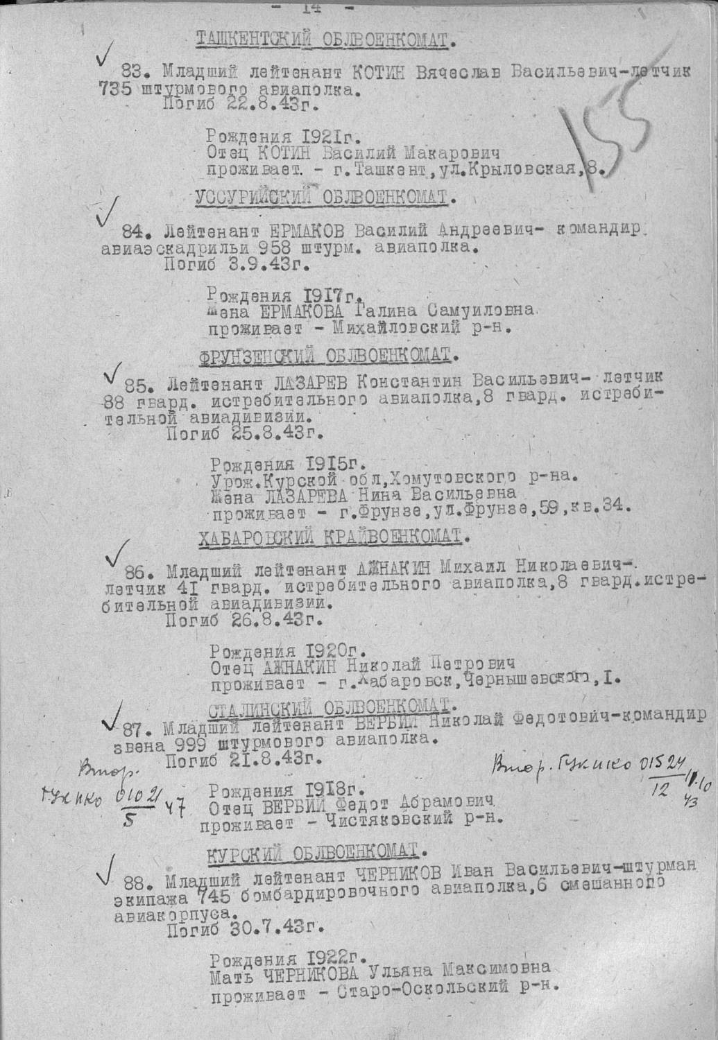 Доброго дня! Помогите пожалуйста найти место захоронения моего деда. Из Базы "МЕМОРИАЛ" я узнал, что мой дед - Лазарев Константин Васильевич 1915 г.р. воевал в 88 Гвардейском Истребительном Авиаполку и погиб 25 августа 1943 года в воздушном бою. В Базе написано, что упал на территории противника, но где конкретно не сказано. Лазарев Константин Васильевич 1915 года рождения Родился в Курской области, Хомутовский район, село Старшее.