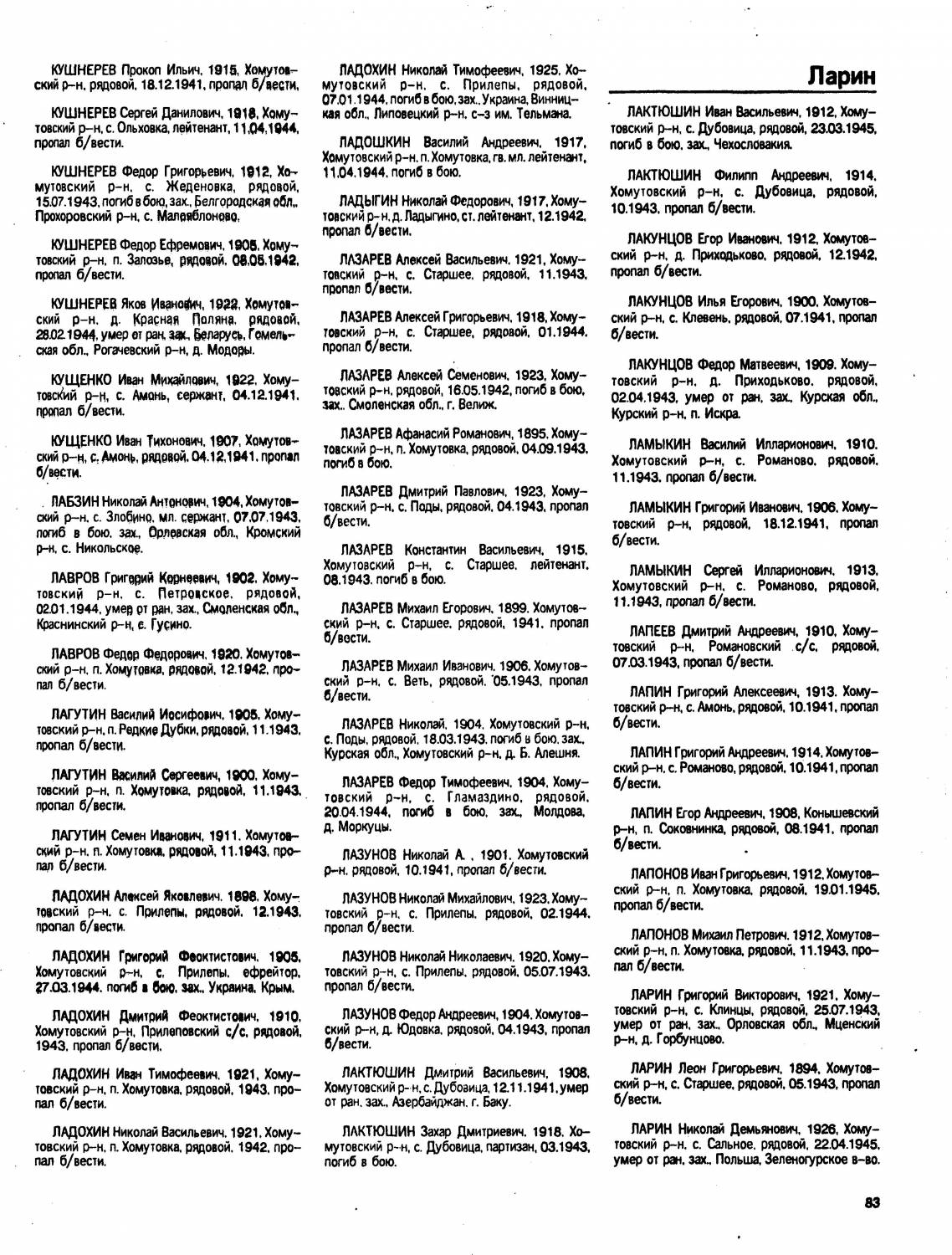 ЛАЗАРЕВ КОНСТАНТИН ВАСИЛЬЕВИЧ, 1915 г.р. Место рождения: Хомутовский р-н, с.Старшее; Звание: лейтенант Причина выбытия: погиб в бою; Дата выбытия: /08/43 Дополнения: Книга памяти Курской области, том 8, Хомутовский р-н. Источник сведений: КП Курской области
