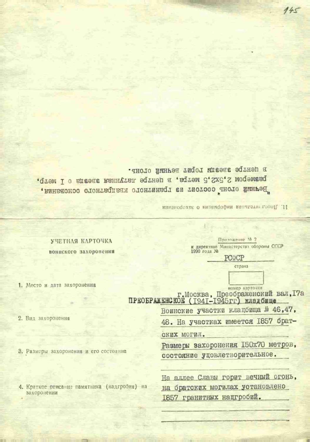 Страна захоронения Россия Регион захоронения Москва Номер захоронения в ВМЦ 77-145 Место захоронения Преображенский вал, 17а, Преображенское кладбище, воинские участки кладбища № 46, 47, 48 Дата создания современного места захоронения __.__.1941 Дата последнего захоронения __.__.1945 Вид захоронения братские могилы Состояние захоронения удовлетворительное Количество могил 1857 Захоронено всего 12830 Захоронено известных 12830 Захоронено неизвестных 0 Кто шефствует над захоронением в/ч 55338