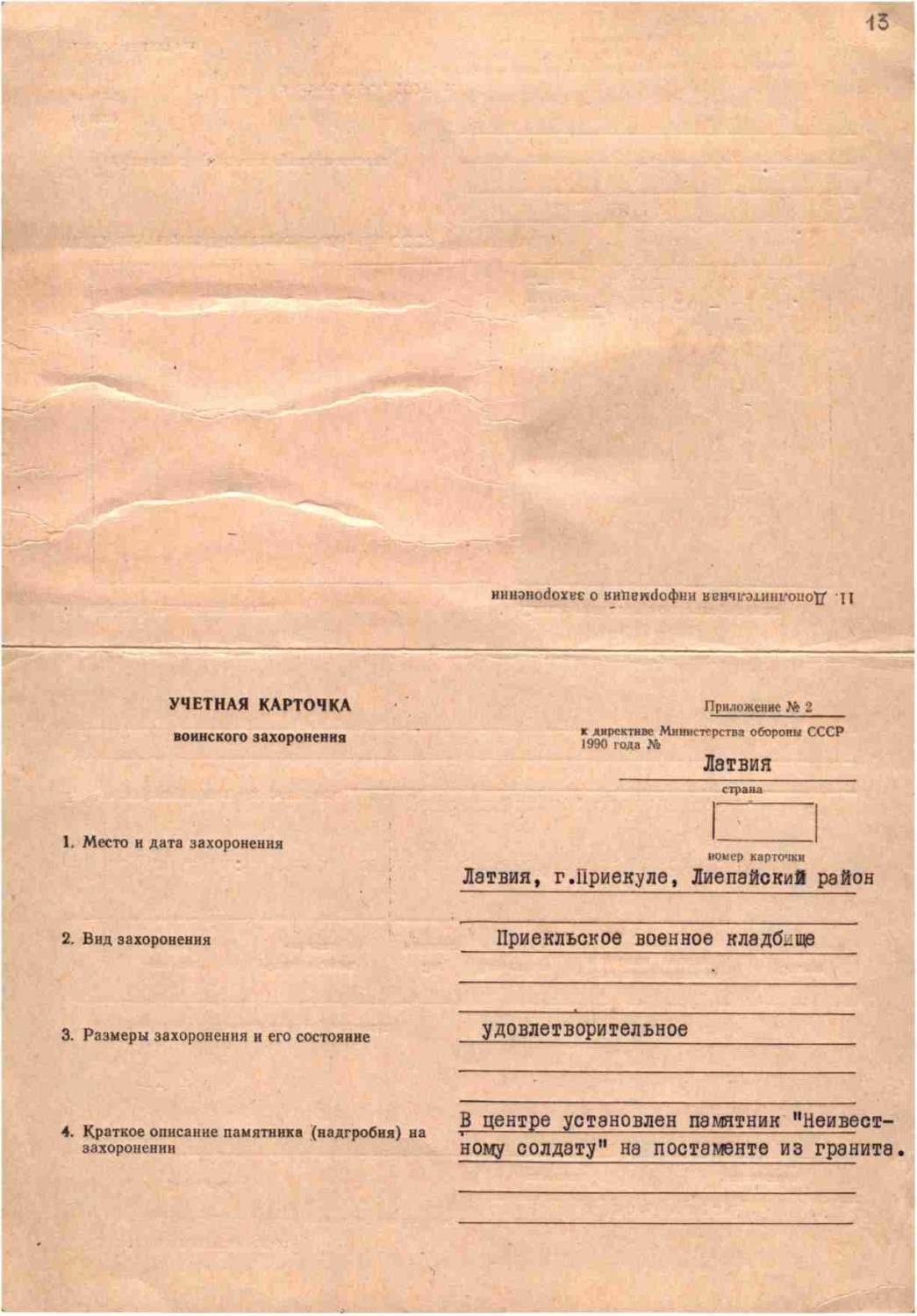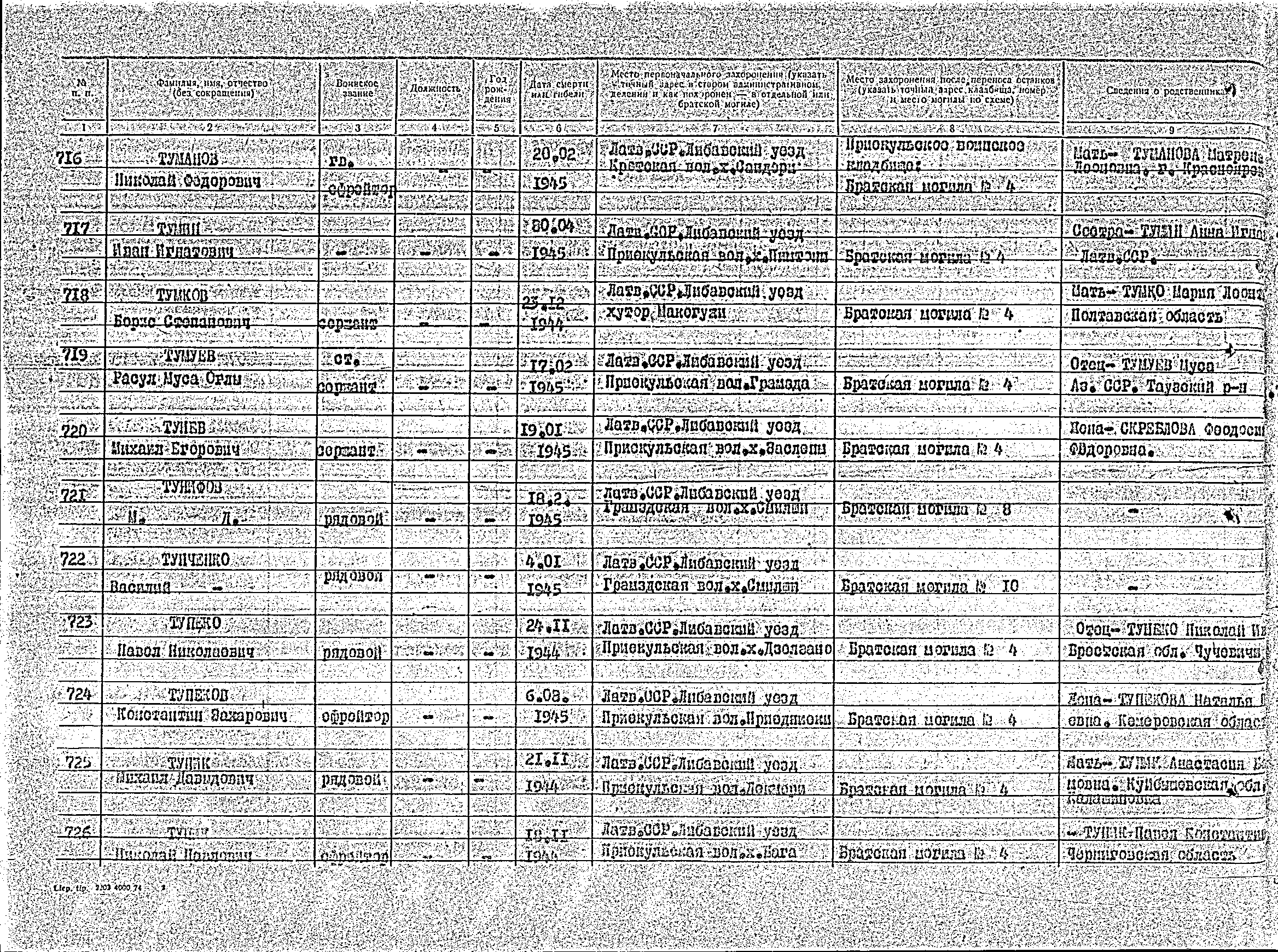 Хозяюшка, Фамилия Тупик Имя Михаил Отчество Давыдович Воинское звание рядовой Дата смерти 21.11.1944 Страна захоронения Латвия Место захоронения г. Приекуле, Лиепайский р-н Могила Братская могила № 4 Откуда перезахоронен Латв. ССР, Либавский уезд, Приекульская волость х. Декмери