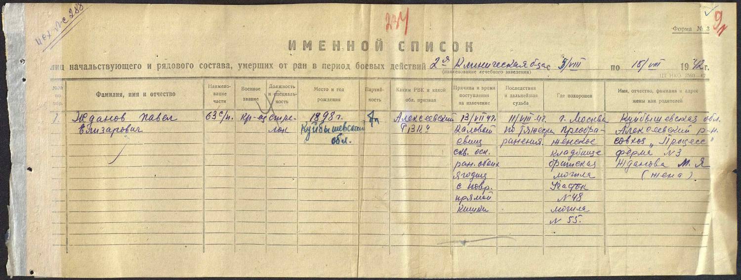 Фамилия Жданов Имя Павел Отчество Елизарович Дата рождения/Возраст __.__.1898 Воинское звание рядовой Дата смерти 11.08.1942 Страна захоронения Россия Регион захоронения Москва Место захоронения г. Москва, Преображенский вал, 17 а, Преображенское кладбище Могила участок № 48, могила № 55