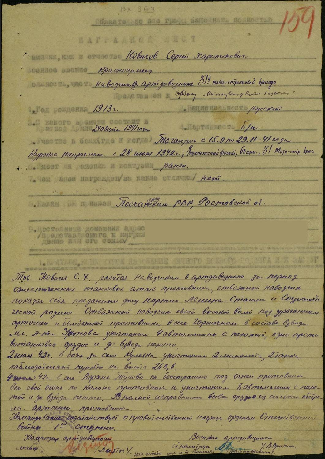 Фамилия НОВЫЧЕВ Имя Сергей Отчество Харитонович Дата рождения/Возраст __.__.1913 Дата выбытия __.__.1943 Название источника информации Книга памяти. Ростовская область. Том 9