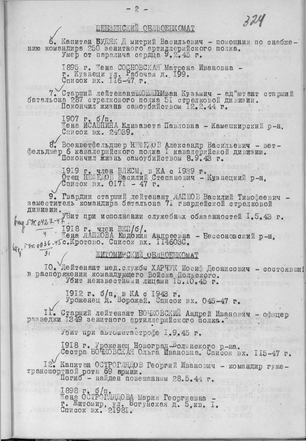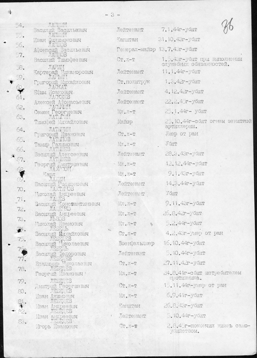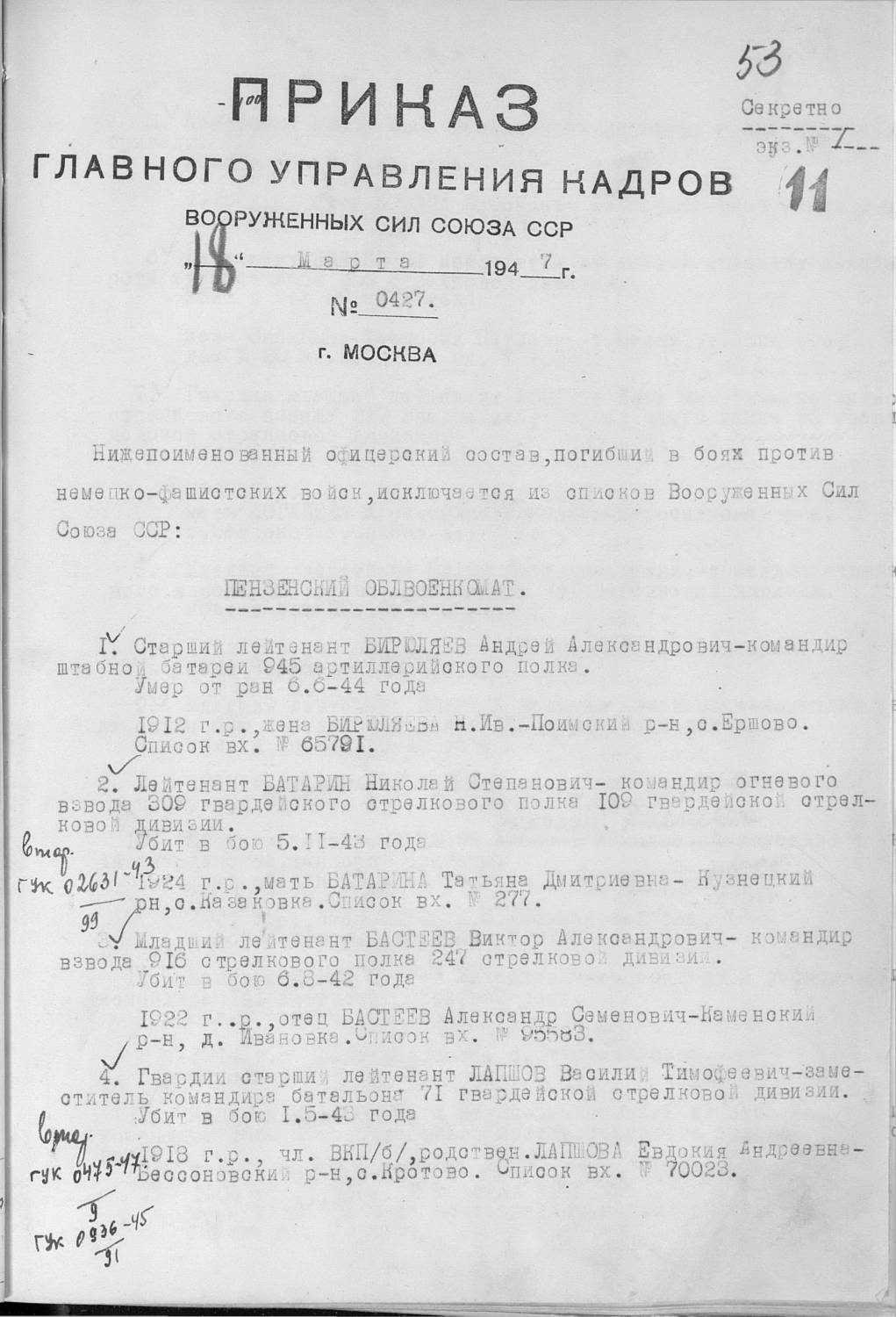 Фамилия Лапшов Имя Василий Отчество Тимофеевич Дата рождения/Возраст __.__.1918 Последнее место службы 71 Гв. СД Воинское звание гв. ст. лейтенант Причина выбытия убит Дата выбытия 01.05.1943 Название источника информации ЦАМО Номер фонда источника информации 33 Номер описи источника информации 563784 Номер дела источника информации 7