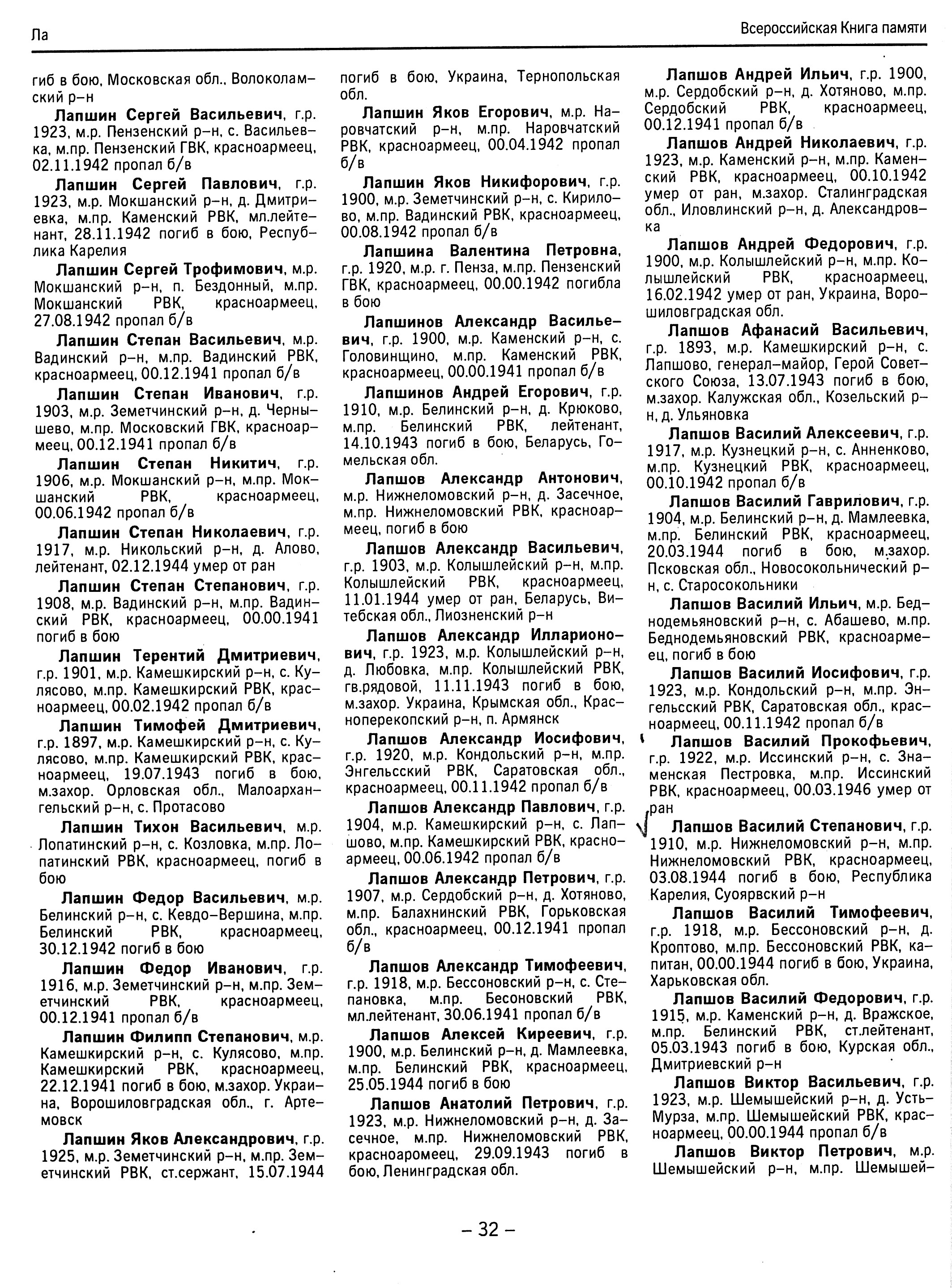 Фамилия Лапшов Имя Василий Отчество Тимофеевич Дата рождения/Возраст __.__.1918 Дата выбытия __.__.1944 Название источника информации Всероссийская Книга Памяти. Пензенская область. Том 5