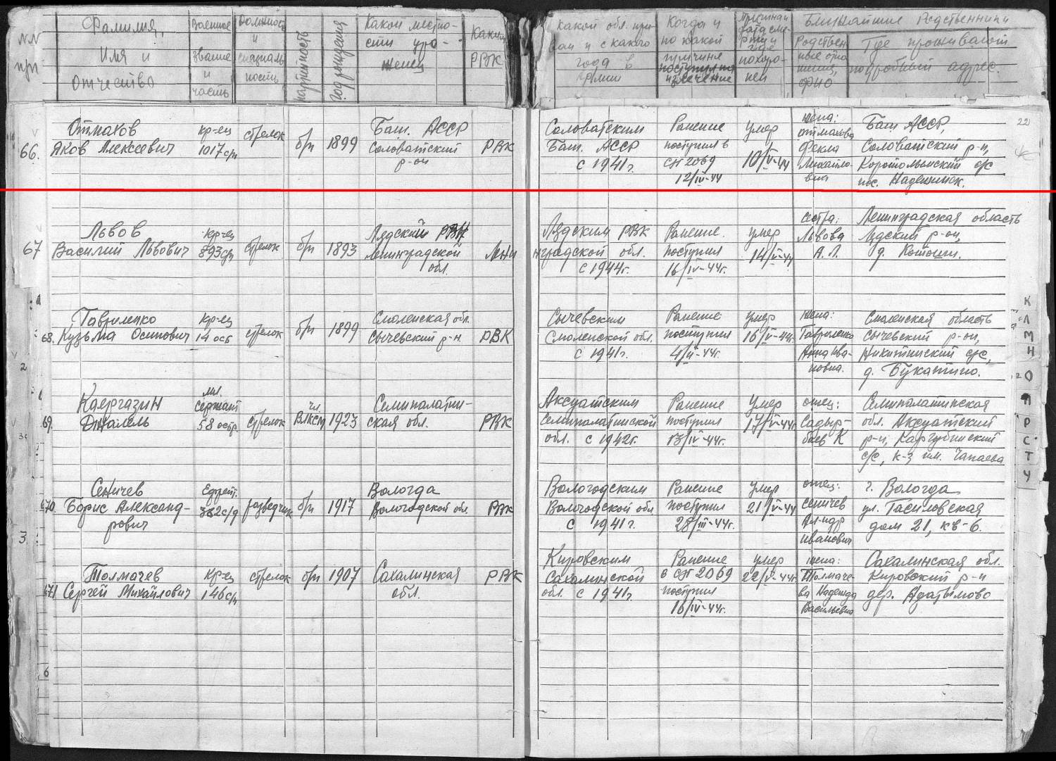 Фамилия ОТМОХОВ Имя Яков Отчество Алексеевич Дата рождения/Возраст __.__.1899 Дата выбытия 10.05.1944 Название источника информации Память. Башкортостан. Книга 17