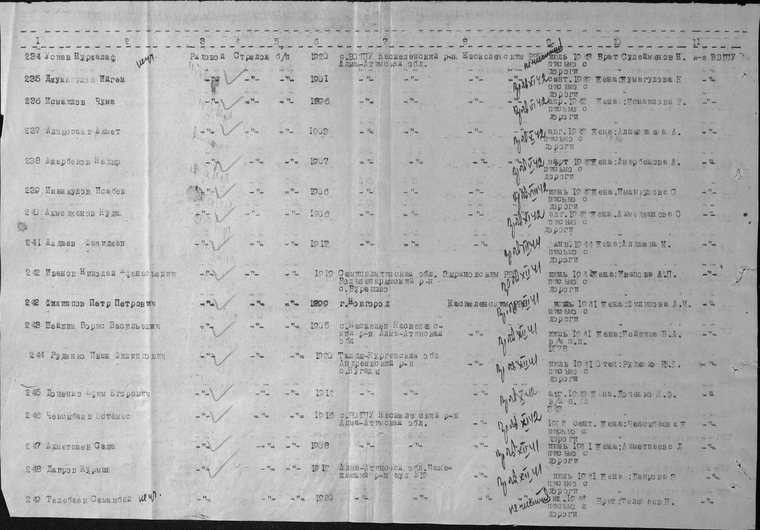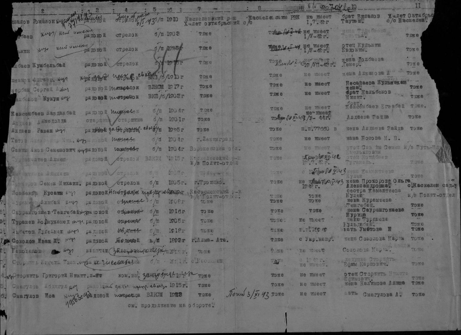 Нурия, Фамилия Алдаев Имя Ахмедолла Отчество Дата рождения/Возраст __.__.1901 Дата и место призыва Каскеленский РВК, Казахская ССР, Алма-Атинская обл., Каскеленский р-н Воинское звание старшина Причина выбытия пропал без вести Дата выбытия __.11.1944 Название источника информации ЦАМО Номер фонда источника информации 58 Номер описи источника информации 977520 Номер дела источника информации 815
