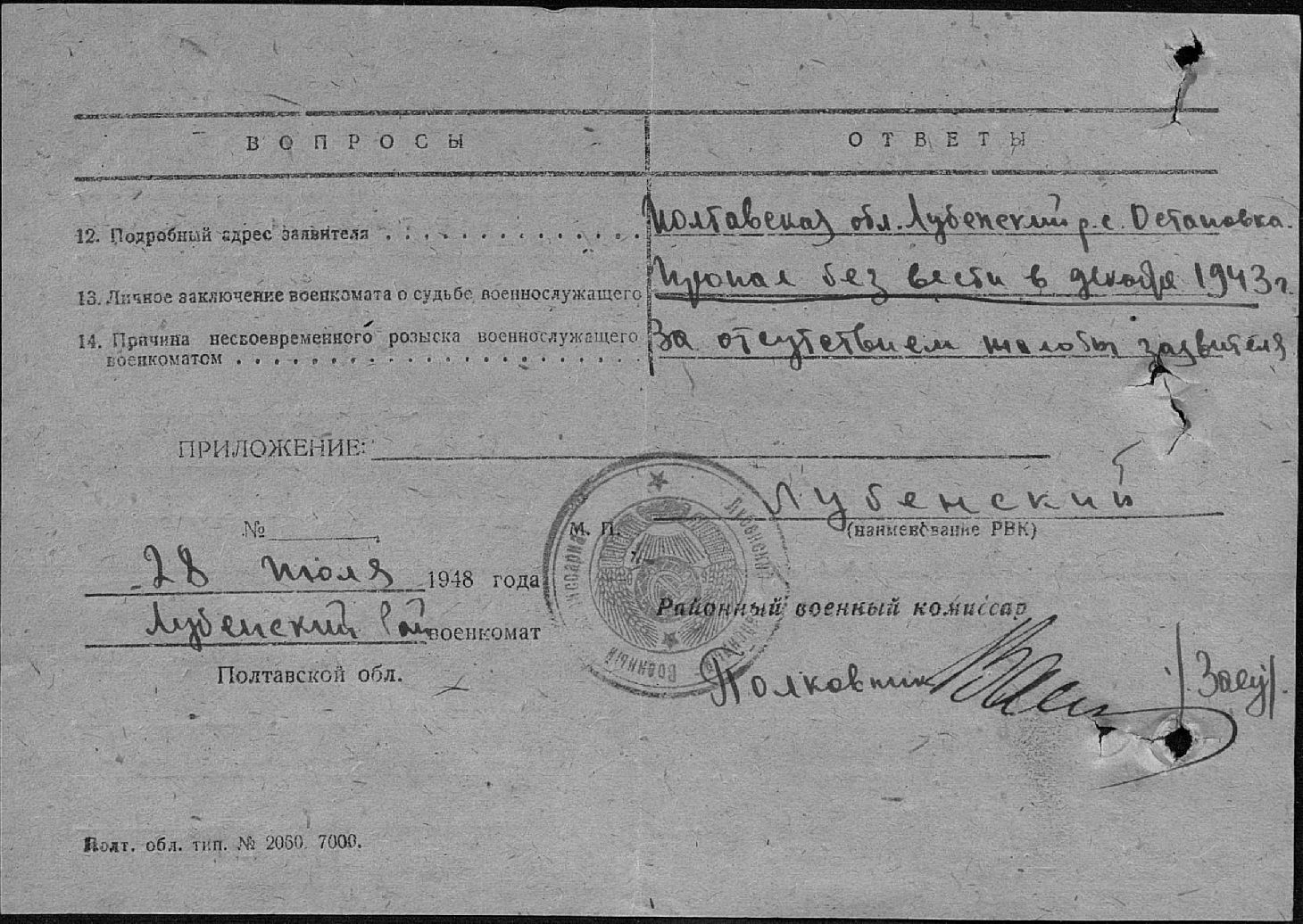Умер 10 мая 1944 г. в госпитале в г. Боровичи Ленинградской обл., а теперь Новгородской обл.