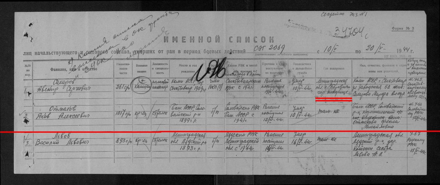 Здравствуйте!Помогите,пожалуйста,найти точное место захоронения моего деда-Отмохова Якова Алексеевича,1899 г.р.,уроженца с.Малояз Салаватского района Башкирской АССР. По данным ОБД Мемориал-рядовой,стрелок 1017 стрелкового полка (автор:полагаем,285 СД). Умер от ран 10.05 1944г.Похоронен в Ленинградской области.