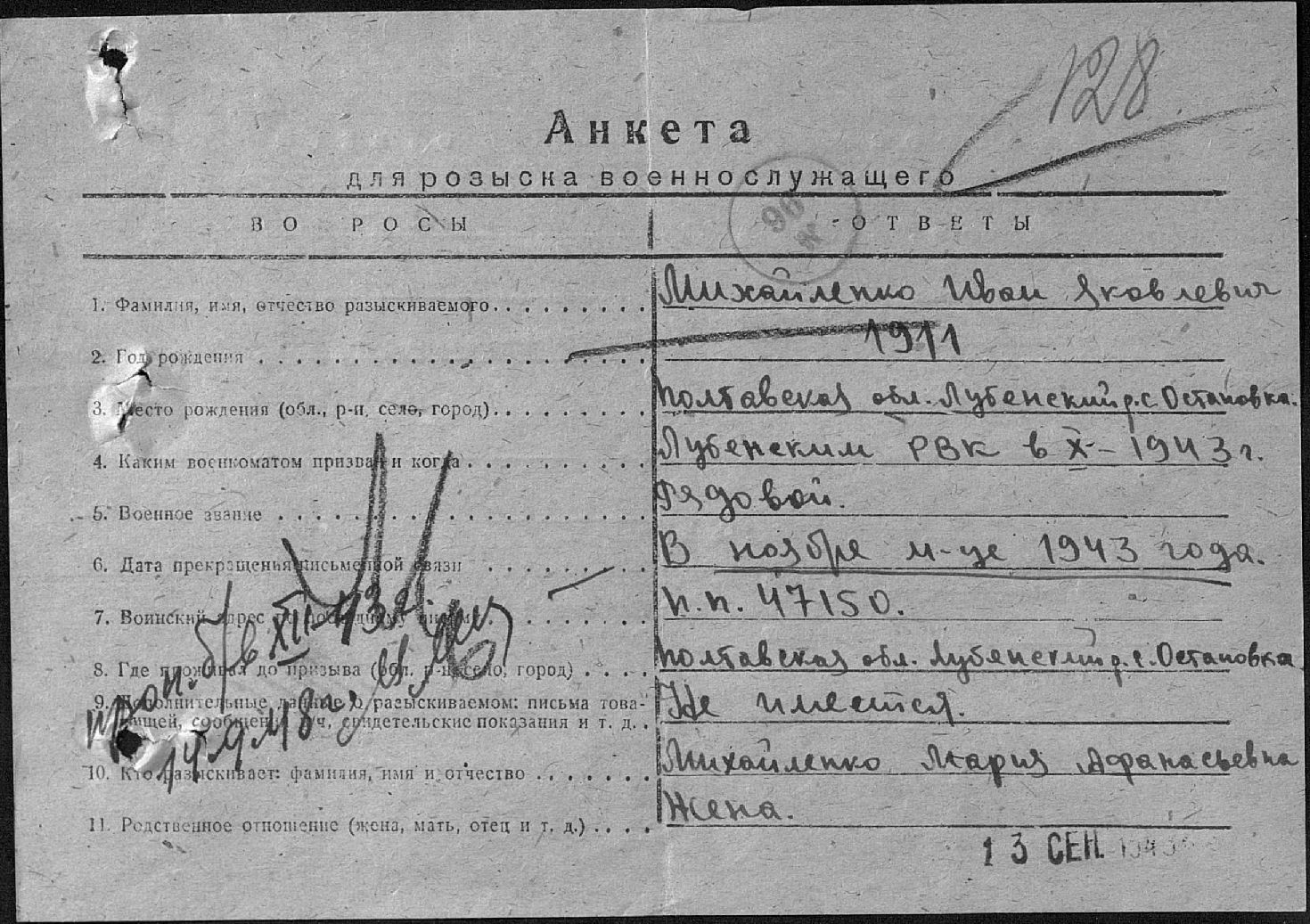 Фамилия Михайленко Имя Иван Отчество Яковлевич Дата рождения/Возраст __.__.1911 Место рождения Украинская ССР, Полтавская обл., Лубенский р-н, с. Остановка Дата и место призыва __.10.1943 Лубенский РВК, Украинская ССР, Полтавская обл. Последнее место службы п/п 47150 Воинское звание рядовой Причина выбытия пропал без вести Дата выбытия __.12.1943 Название источника информации ЦАМО Номер фонда источника информации 58 Номер описи источника информации 977521а Номер дела источника информации 927