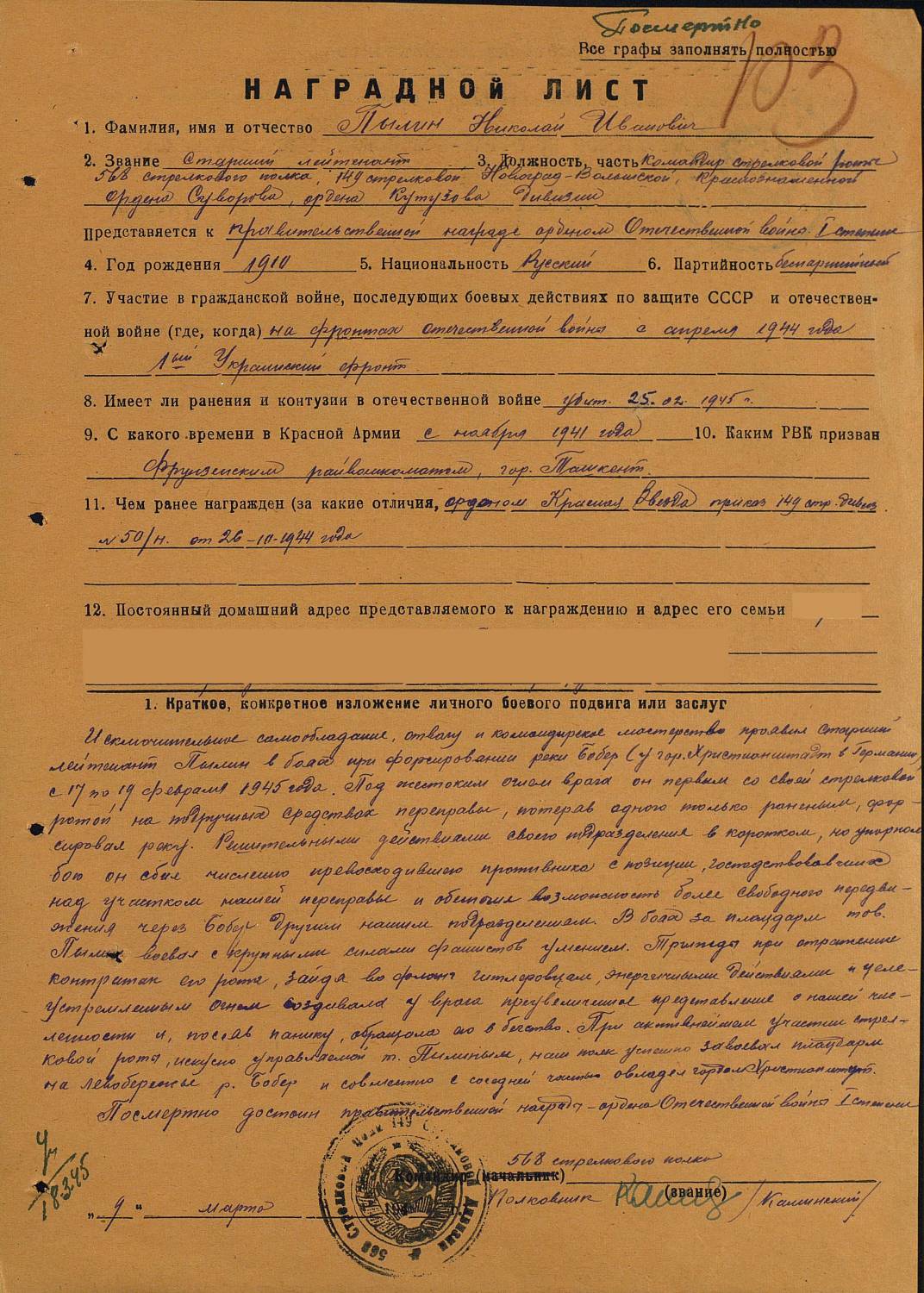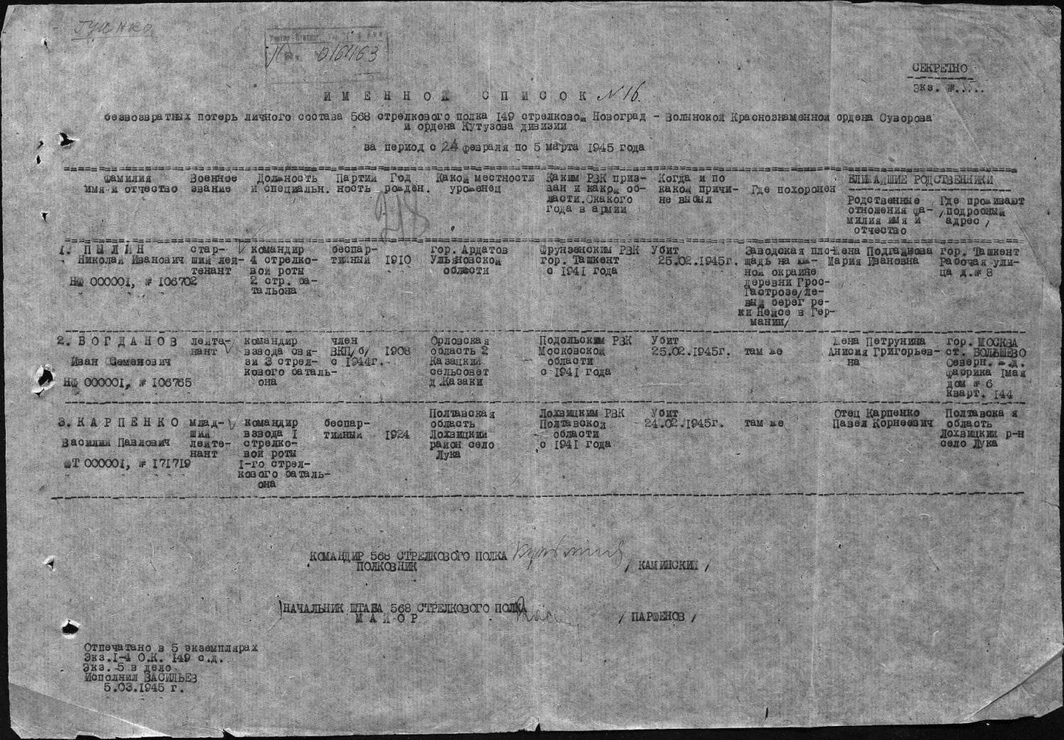 Здравствуйте!!! Пожалуйста помогите узнать хоть какую нибудь еще информацию по этому человеку, желательно касающуюся захоронения. Заранее огромной спасибо. Фамилия Пылин Имя Николай Отчество Иванович Дата рождения/Возраст __.__.1910 Место рождения Ульяновская обл., г. Ардатов Последнее место службы 149 СД 568 СП Воинское звание ст. лейтенант Причина выбытия убит Дата выбытия 25.02.1945 Название источника информации ЦАМО Номер фонда источника информации 33 Номер описи источника информации 11458 Номер дела источника информации 647