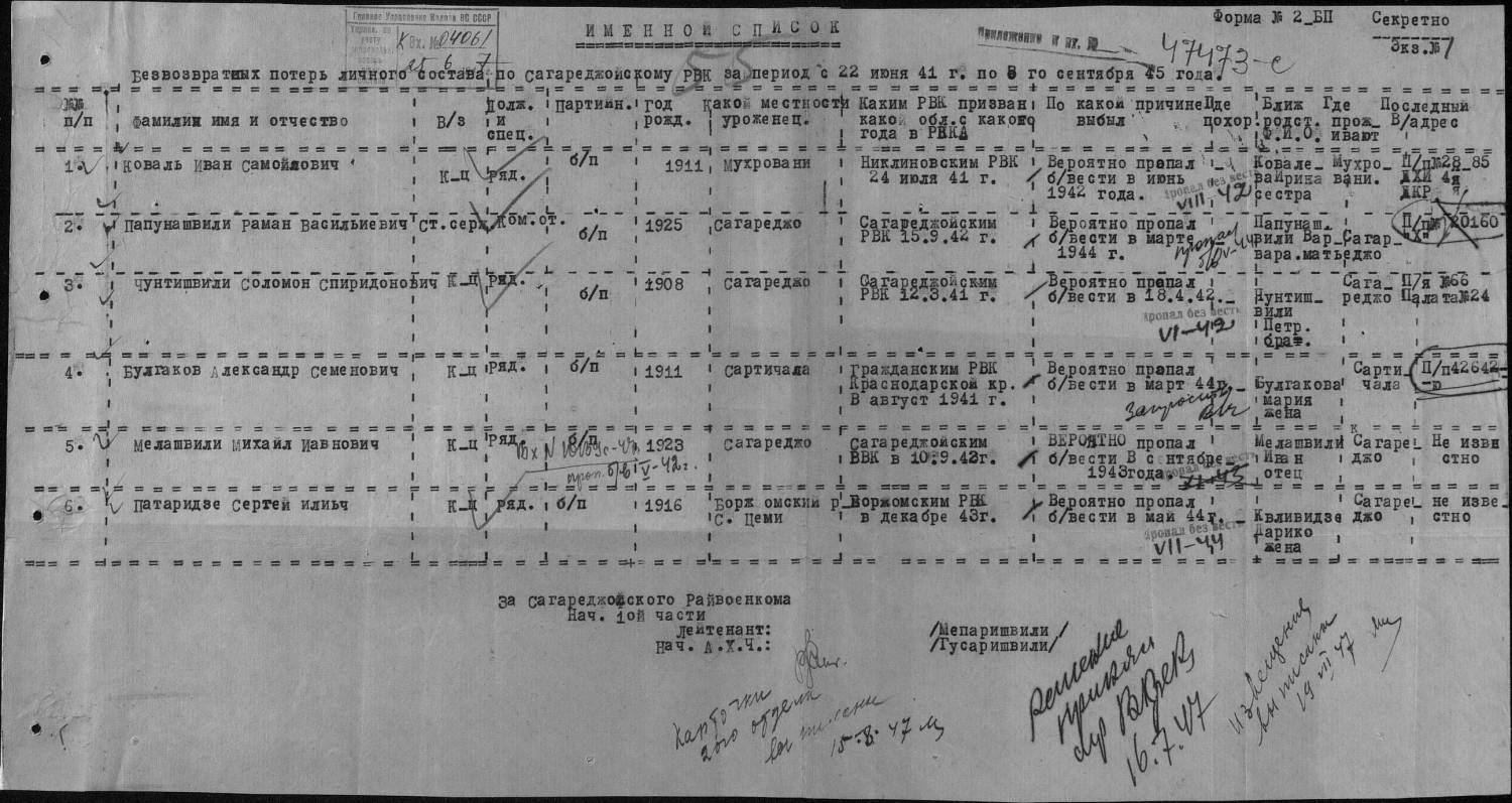 Фамилия Папунашвили Имя Раман Отчество Васильевич Дата рождения/Возраст __.__.1925 Дата и место призыва 15.09.1942 Сагареджинский РВК, Грузинская ССР, Сагареджинский р-н Последнее место службы п/п 20160 "Х" Воинское звание ст. сержант Причина выбытия пропал без вести Дата выбытия __.05.1944 Название источника информации ЦАМО Номер фонда источника информации 58 Номер описи источника информации 977520 Номер дела источника информации 485