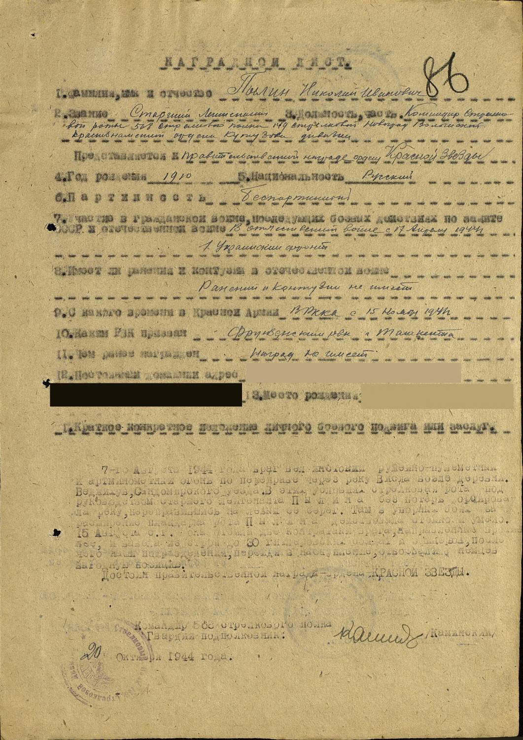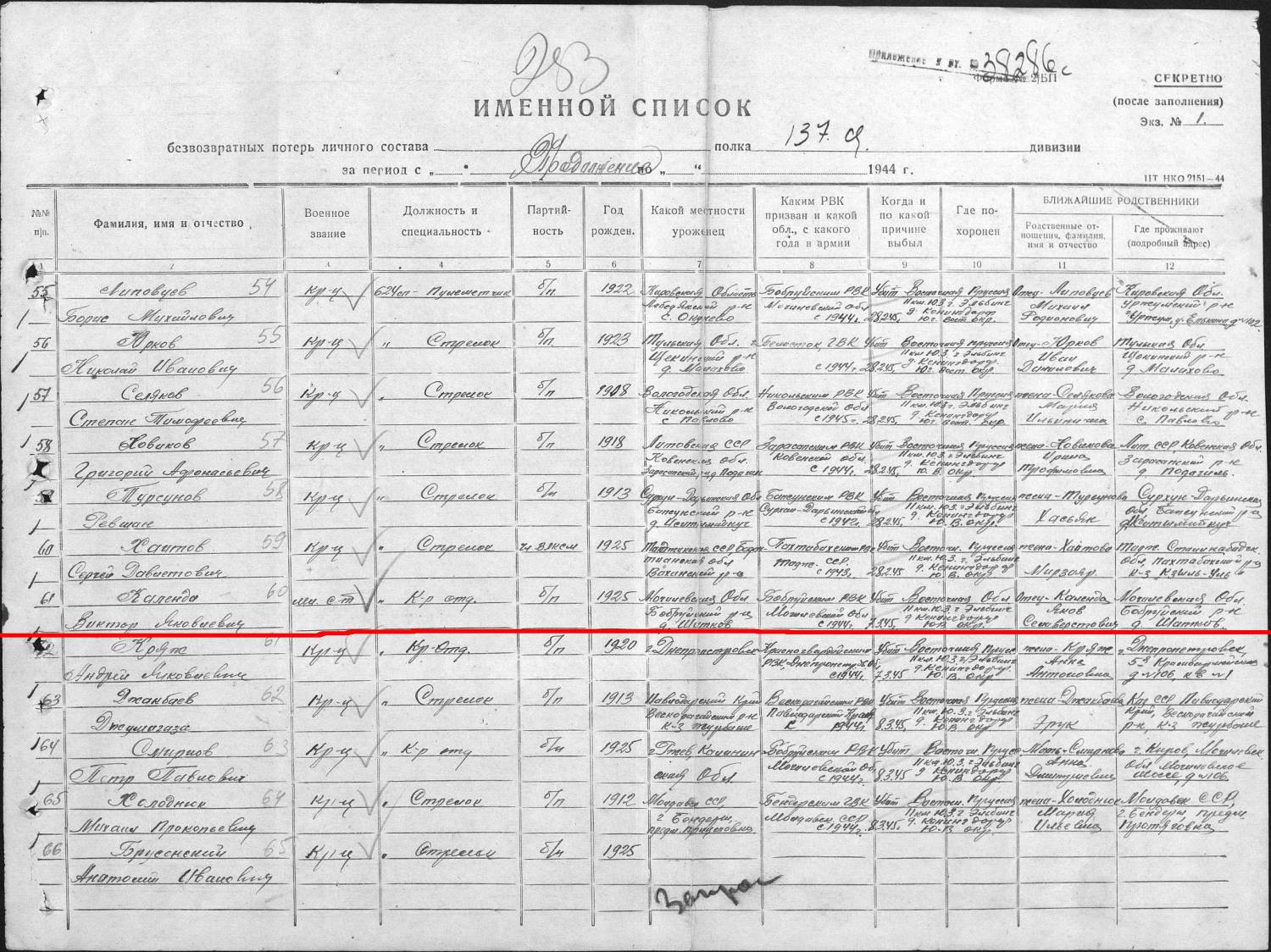 Фамилия Календа Имя Виктор Отчество Яковлевич Дата рождения/Возраст __.__.1925 Место рождения Могилевская обл., Бобруйский р-н, д. Шитков Дата и место призыва __.__.1944, Бобруйский РВК, Белорусская ССР, Могилевская обл., Бобруйский р-н Последнее место службы 137 СД Воинское звание мл. сержант Причина выбытия убит Дата выбытия 07.03.1945 Название источника информации ЦАМО Номер фонда источника информации 58 Номер описи источника информации 18003 Номер дела источника информации 411