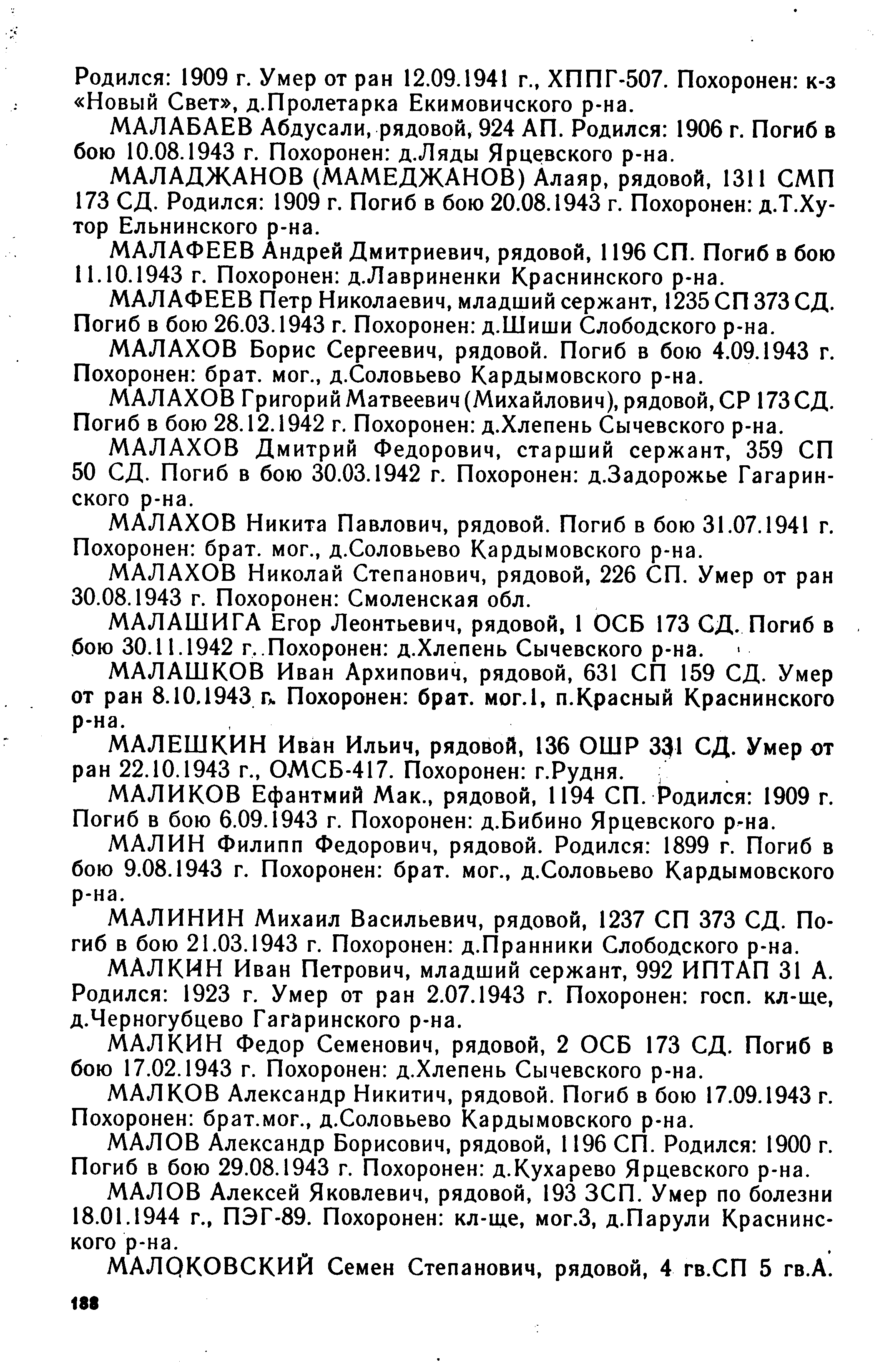 Фамилия Малкин Имя Иван Отчество Петрович Дата рождения/Возраст __.__.1923 Место рождения Московская обл., Звенигородский р-н, д. М. Слобода Дата и место призыва Ленинский РВК, Московская обл., Ленинский р-н Последнее место службы ЗФ 992 ИПТАП Воинское звание мл. сержант Причина выбытия умер от болезни Дата выбытия 01.07.1943 Название источника информации ЦАМО Номер фонда источника информации 58 Номер описи источника информации 18001 Номер дела источника информации 296