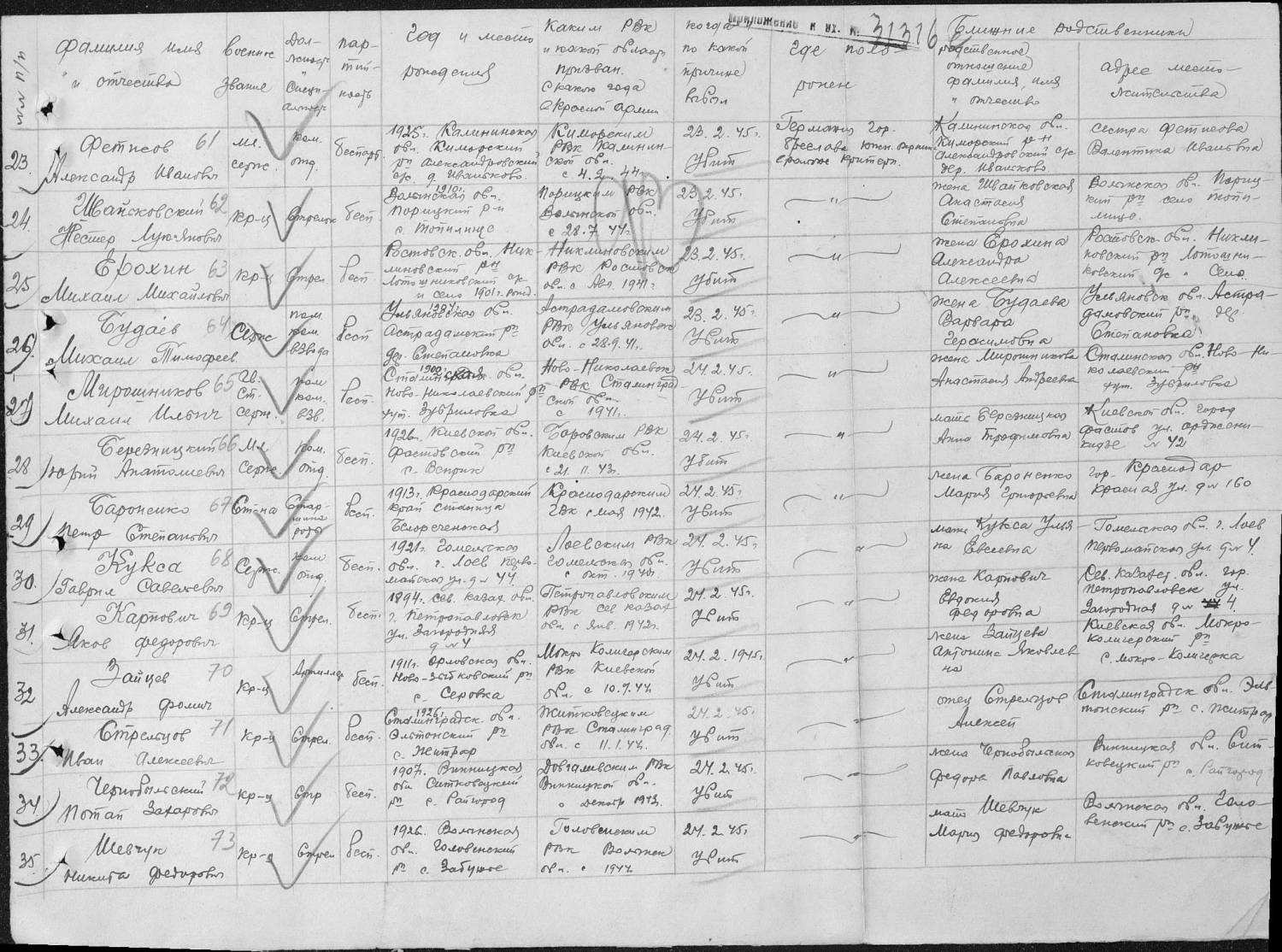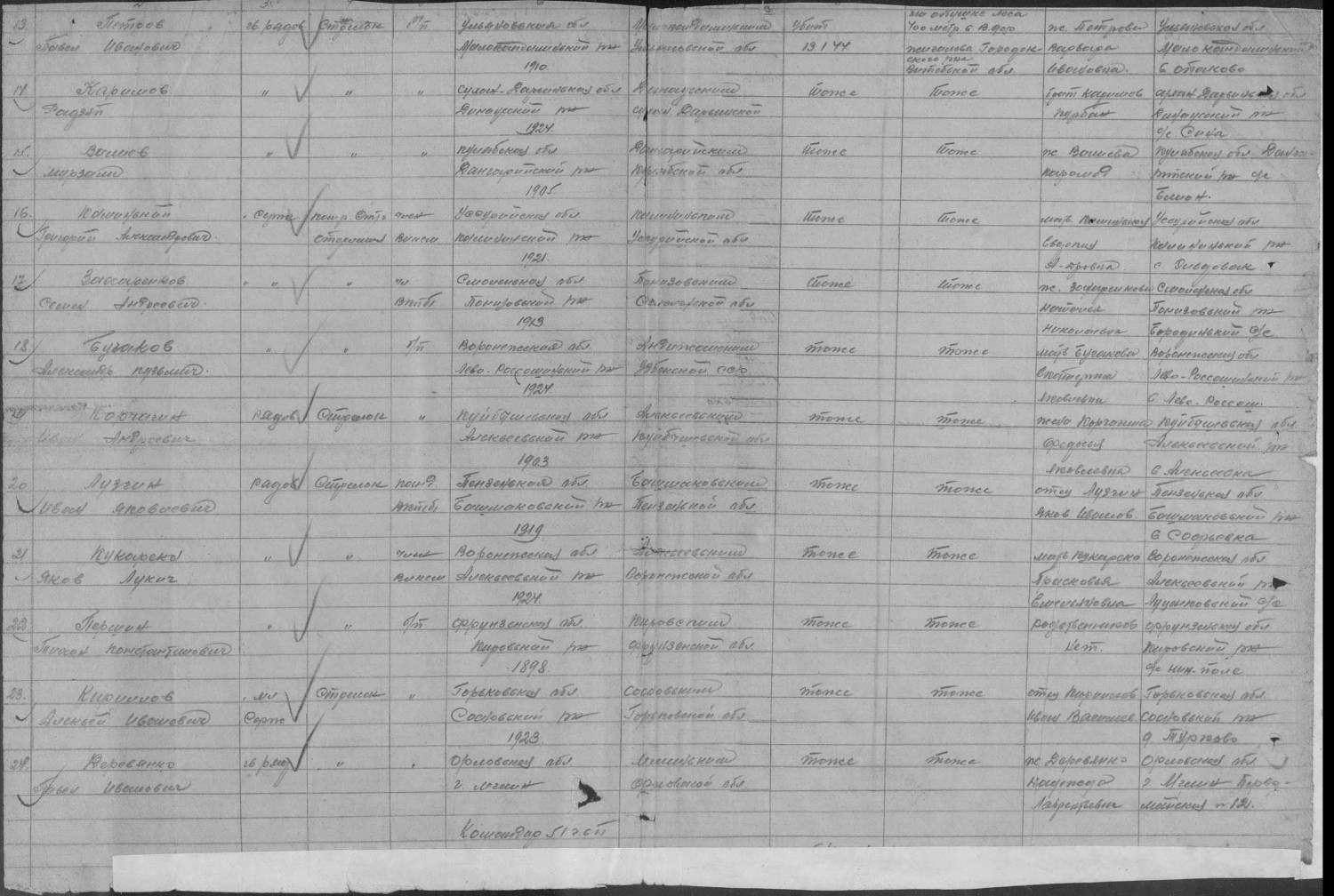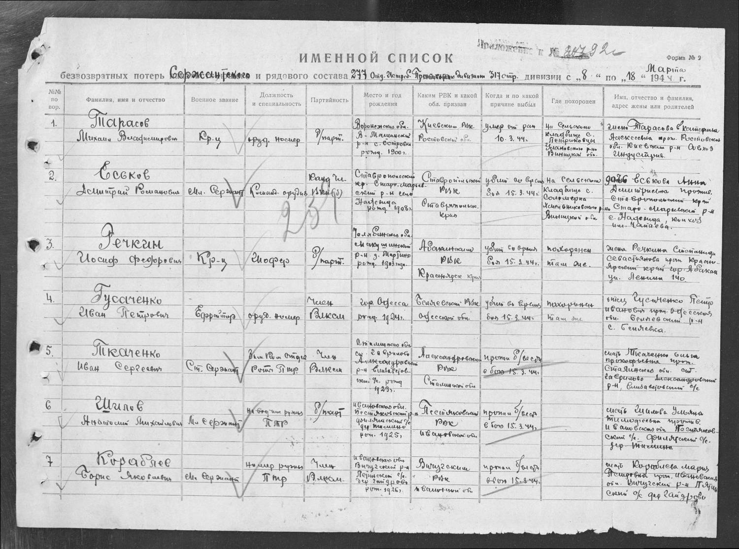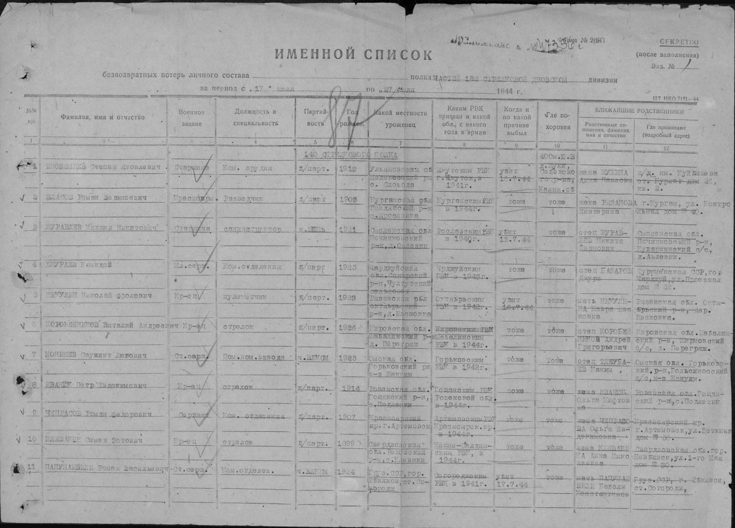 Vnuchka8139, Фамилия Корчагин Имя Иван Отчество Андреевич Дата рождения/Возраст __.__.1903 Место рождения Куйбышевская обл., Алексеевский р-н Дата и место призыва Алексеевский РВК, Куйбышевская обл., Алексеевский р-н Последнее место службы 18 Гв. сд Воинское звание рядовой Причина выбытия убит Дата выбытия 13.01.1944 Название источника информации ЦАМО Номер фонда источника информации 58 Номер описи источника информации 18002 Номер дела источника информации 1196