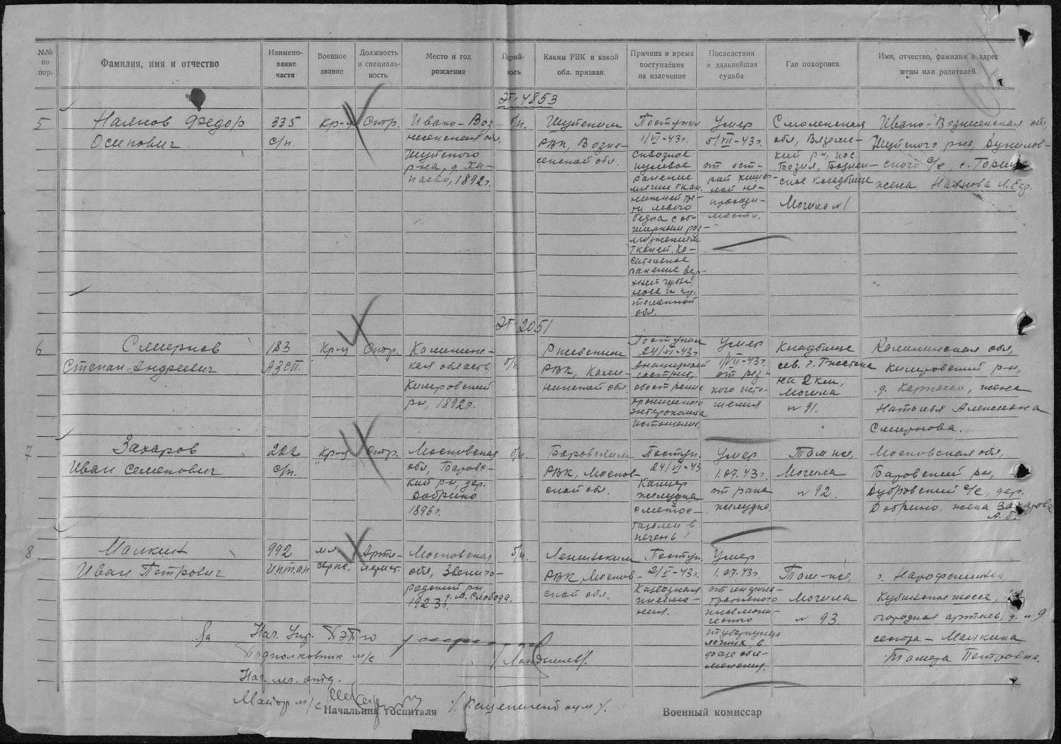 9VISHINKA9, а ведь эт оазался действительно наш Малкин, я узнала по записям о его сестре Тамаре. Бабушка очень обрадовалась. А вы не знаете, где можно взять информацию о кадбищах (были ли перезахоронения)? Выяснила, что изначально он был похоронен в г. Гжатск (кладбище сев. на 2 км), нашла, что в г. Гжатске и его округе сейчас четыре братскихзахоронения, но ни в одном его не нашла. Нашла фотографии леса, недалеко от Гжатска, с могилами старыми, все уже заброшено давно и даже, как пишут, на карте нет этого кладбища. Как можно узнать судьбу захоронения? Если там лежат участники ВОВ, неужели нельзя привести его в порядок или перезахоронить, подскажите, что можно сделать?