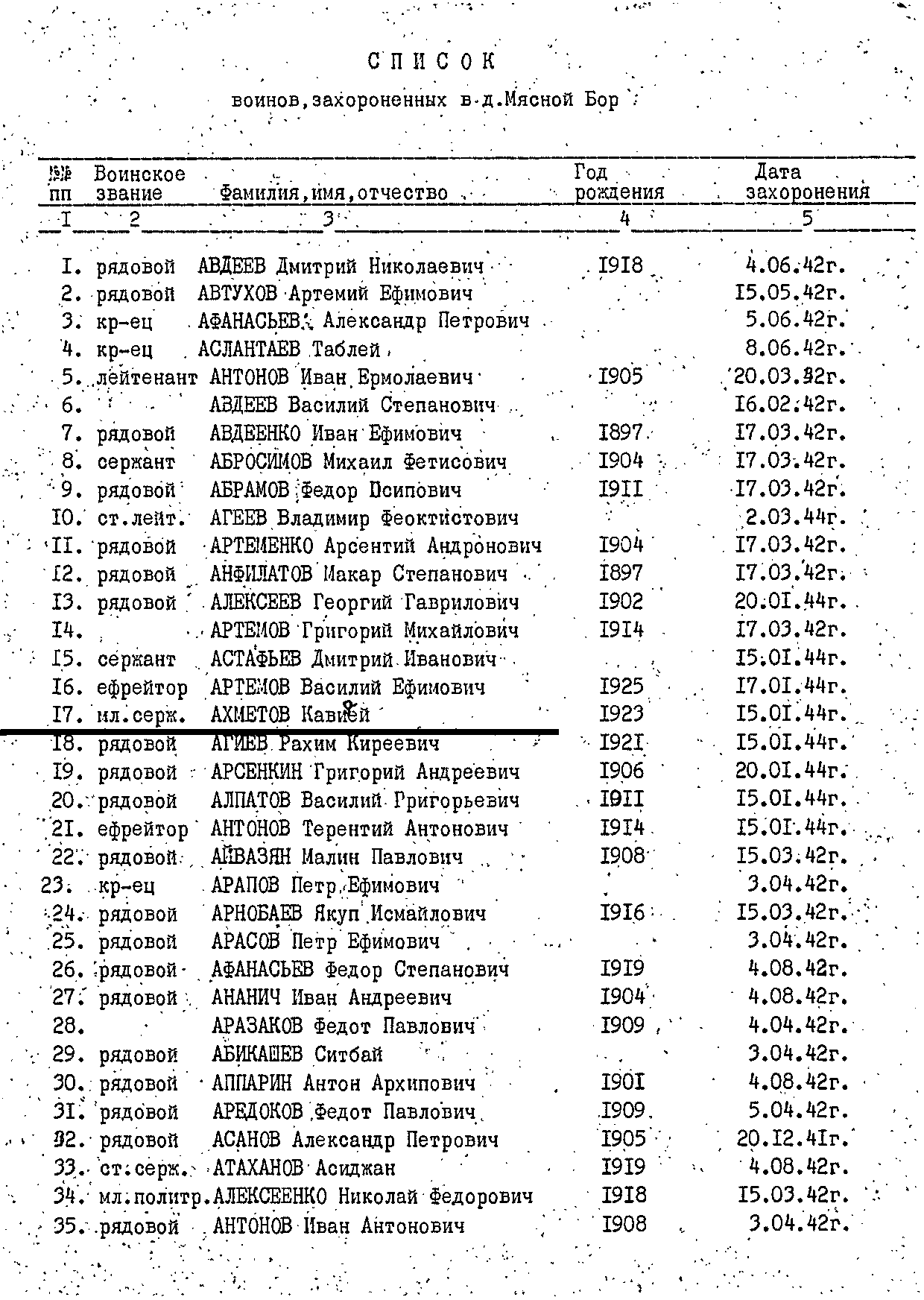 Фамилия Ахметов Имя Кавидей Отчество Дата рождения/Возраст __.__.1923 Воинское звание мл. сержант Дата смерти 15.01.1944 Страна захоронения Россия Регион захоронения Новгородская обл. Место захоронения Новгородский р-н, центр д. Мясной Бор