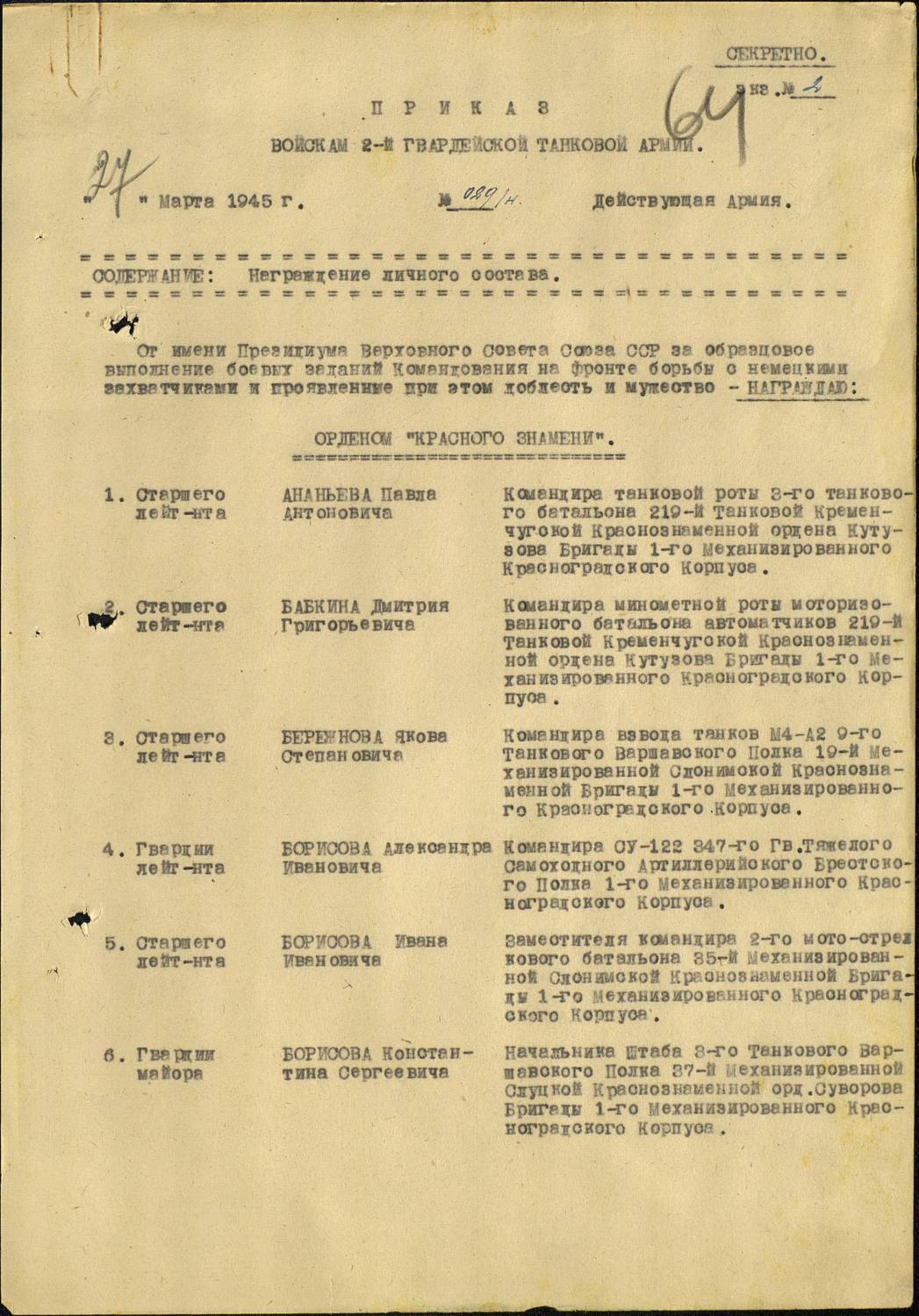 Фамилия Ананьев Имя Павел Отчество Антонович Дата рождения/Возраст __.__.1917 Последнее место службы 1 мех. корп. Воинское звание ст. лейтенант Причина выбытия убит Дата выбытия 04.03.1945 Название источника информации ЦАМО Номер фонда источника информации 33 Номер описи источника информации 11458 Номер дела источника информации 653